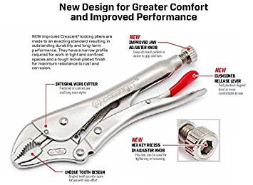 Q: What materials are the Crescent 7" Straight Jaw Locking Pliers made of?A: The Crescent 7" Straight Jaw Locking Pliers are primarily made of high-quality steel with a nickel-plated finish that resists rust and corrosion. The release lever features a red plastisol dip for improved comfort.