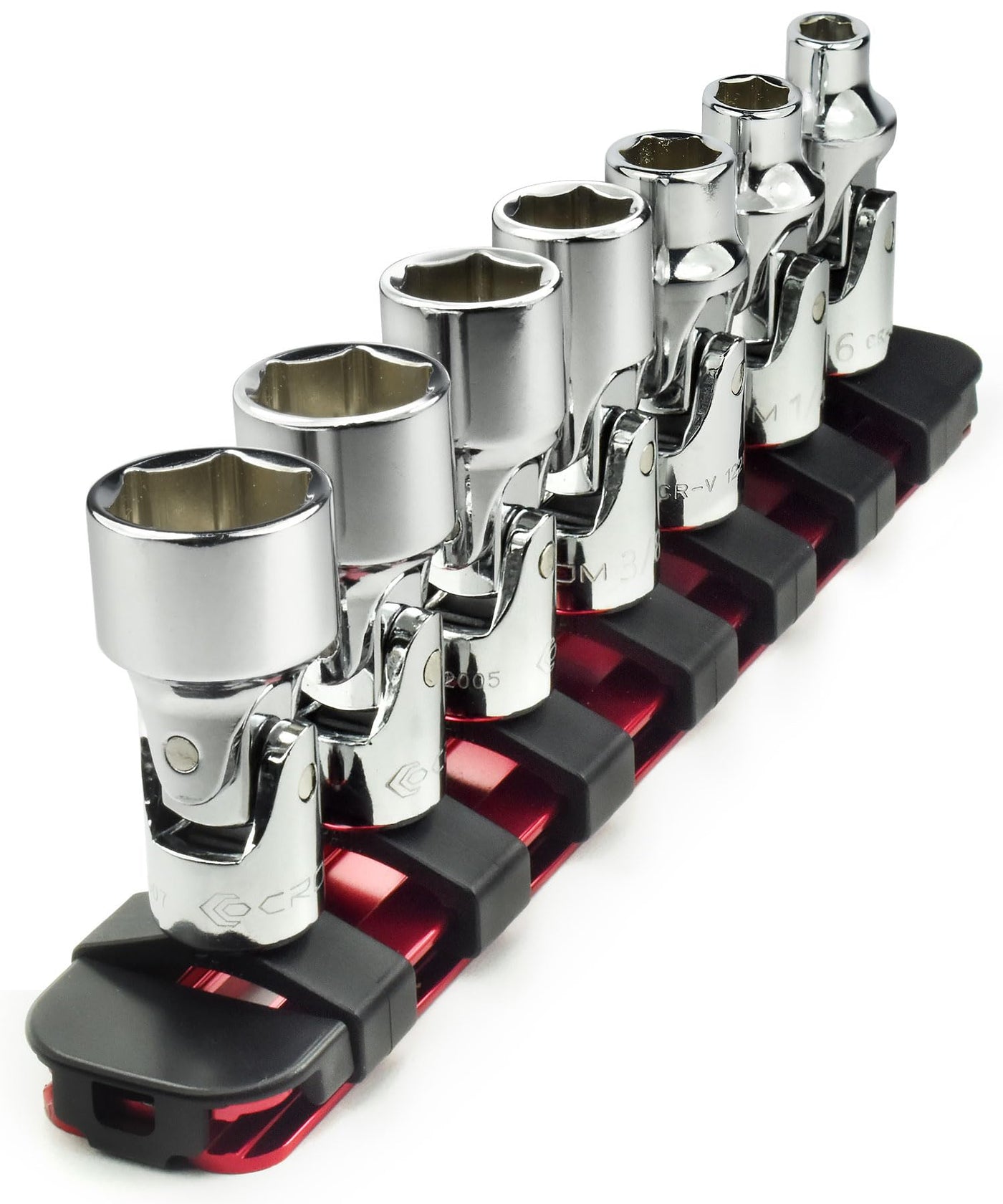 Crom Universal Flex Socket Set - 6-Point Swivel Socket Set - Swivel Joint For Easier Access To Tight Spaces - Aluminum Socket Storage Rail Included (1/4' Dr. 7Pcs Sae Set)