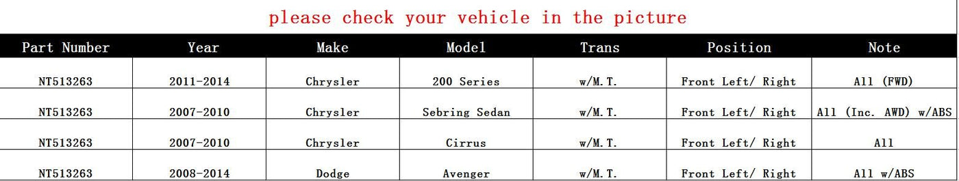 Q: What vehicles are compatible with the CRS 513263 Front Wheel Hub Bearing Assembly?A: The CRS 513263 Front Wheel Hub Bearing Assembly is designed to fit a variety of vehicles, including the Dodge Avenger, Chrysler 200, and Chrysler Sebring equipped with ABS. Always check your vehicle's specifications to ensure compatibility.