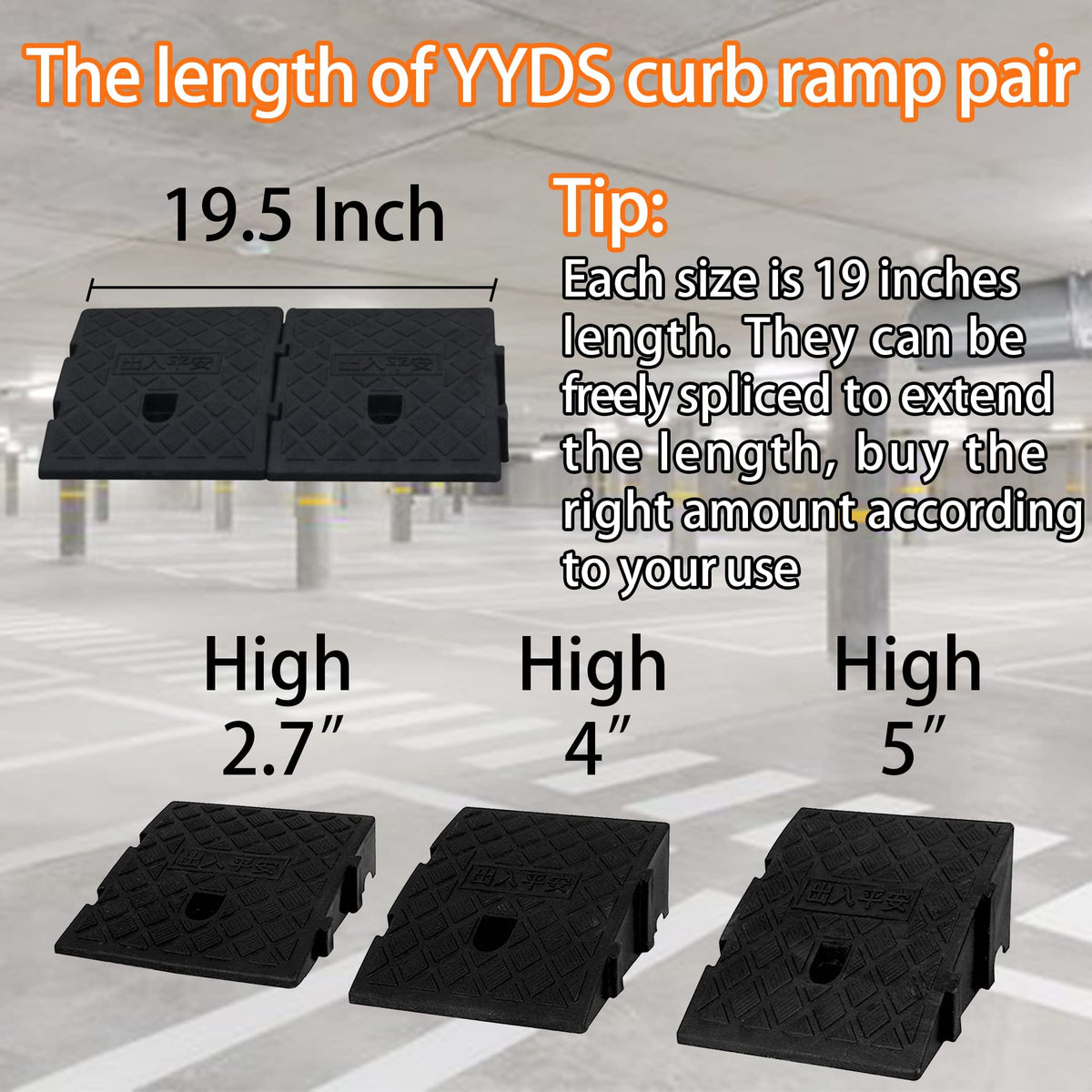 Q: What are the dimensions and weight capacity of the Curb Ramp?A: The Curb Ramp measures 9.8 inches wide, 10.5 inches deep, and comes in three height options: 2.7 inches, 4 inches, and 5 inches. When combined, the two ramp units total 19.5 inches in width and can support up to 4400 lbs.