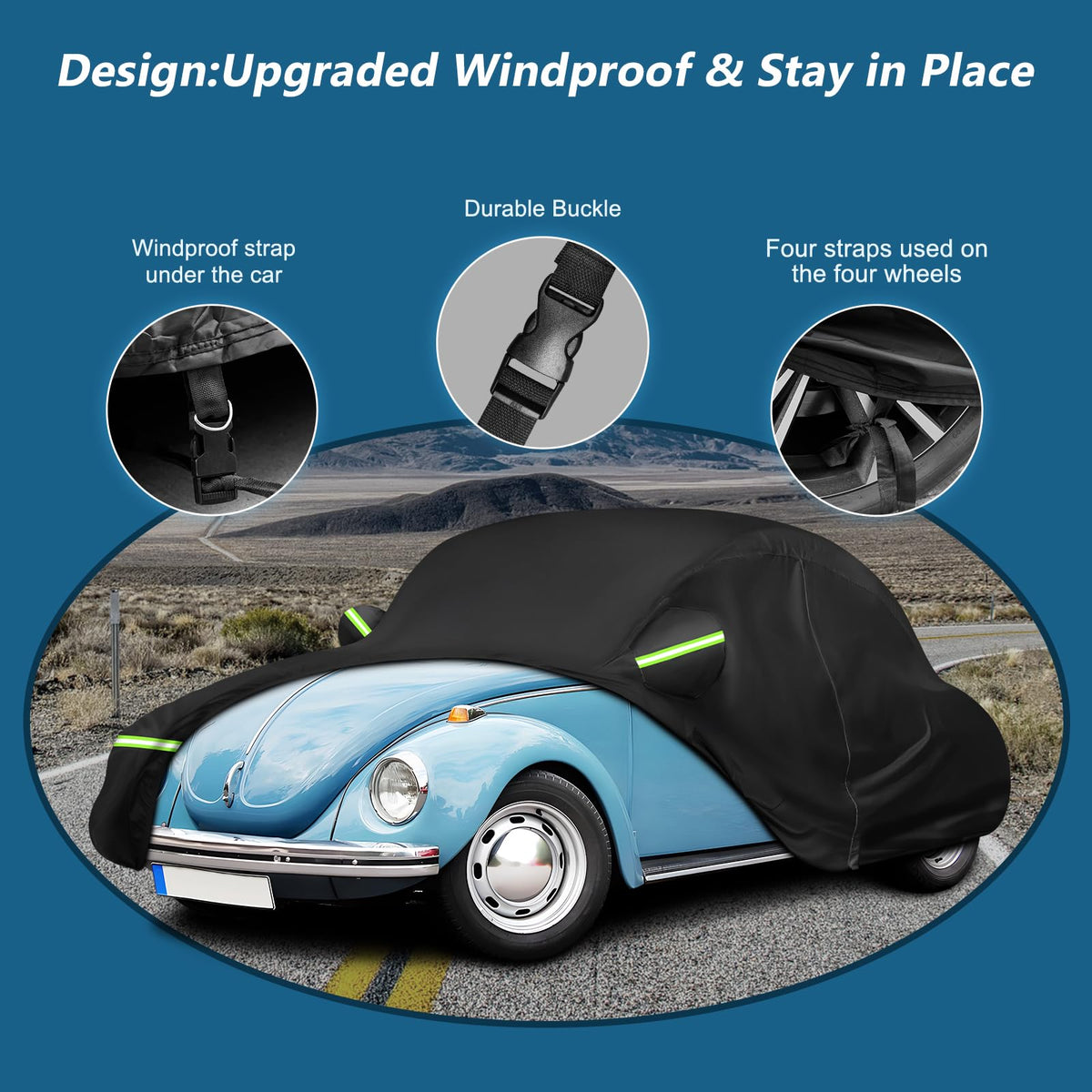 Q: Does the car cover include features for secure fitting in windy conditions?A: Yes, the car cover is designed with four straps for the wheels, a windproof buckle, and an elastic hem at both the front and rear to keep it securely in place even during heavy winds.