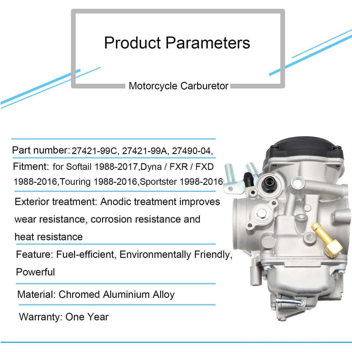 Replacement for: Softail 1988-2017, Dyna / FXR / FXD 1988-2016, Touring 1988-2016, Sportster 1998-2016. Replacement for CV40 Road King Super Glide. Specification: Part Number: 27421-99C, 27421-99A, 27490-04, 27465-04. Inner Diameter: Approx.4cm / 1.57 In. Outer Diameter: Approx.6.7cm / 2.63 In. The stock main jet is #185 & the stock slow jet #42. Please carefully read the detailed parameters, and refer to the picture before determining the purchase Package Includes: 1x Carburetor, 2x Fuel Lines, 1x Fuel Filter, 1x Spark Plug, 3x Main Jets and 3x Slow Jets.