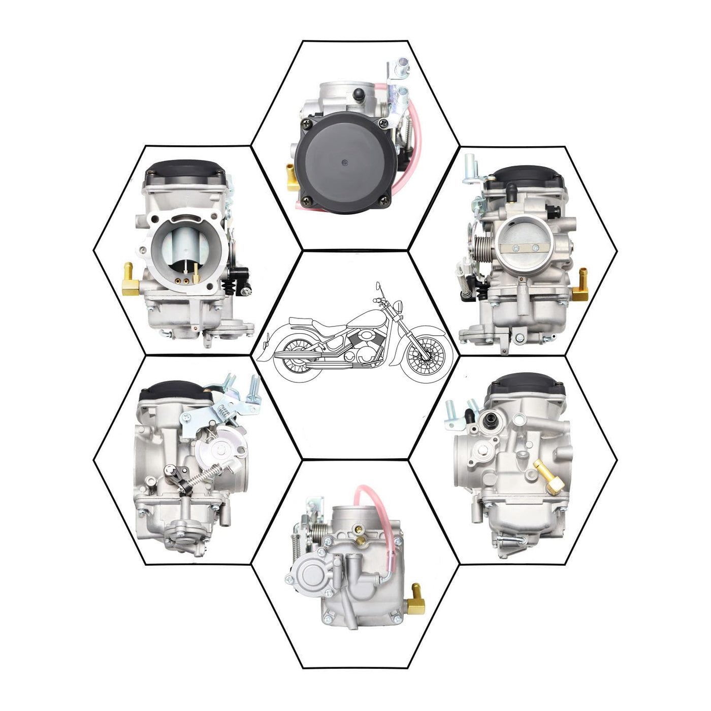 Q: What is included in the package when purchasing the CV40 Carburetor?A: The package includes 1x Carburetor, 2x Fuel Lines, 1x Fuel Filter, 1x Spark Plug, 3x Main Jets, and 3x Slow Jets, providing everything you need for a complete installation.