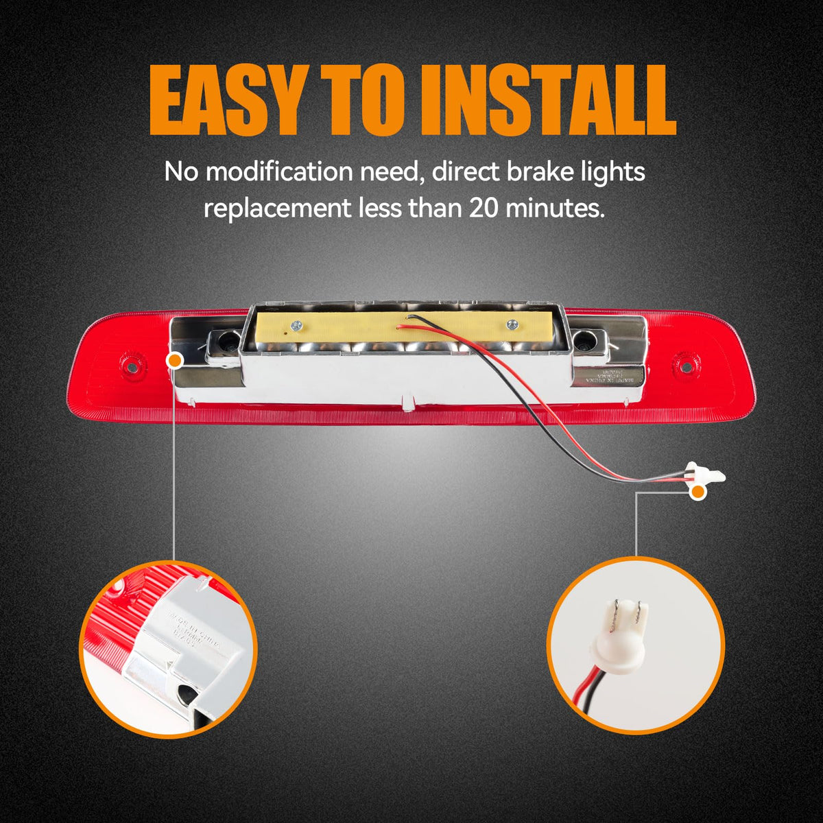 Q: What features make the Cxdar Third Brake Light durable?A: The Cxdar Third Brake Light is IP65 waterproof, constructed with a sturdy lens and ABS housing, which enhances its resistance to water, dust, and snow, thus prolonging its lifespan.