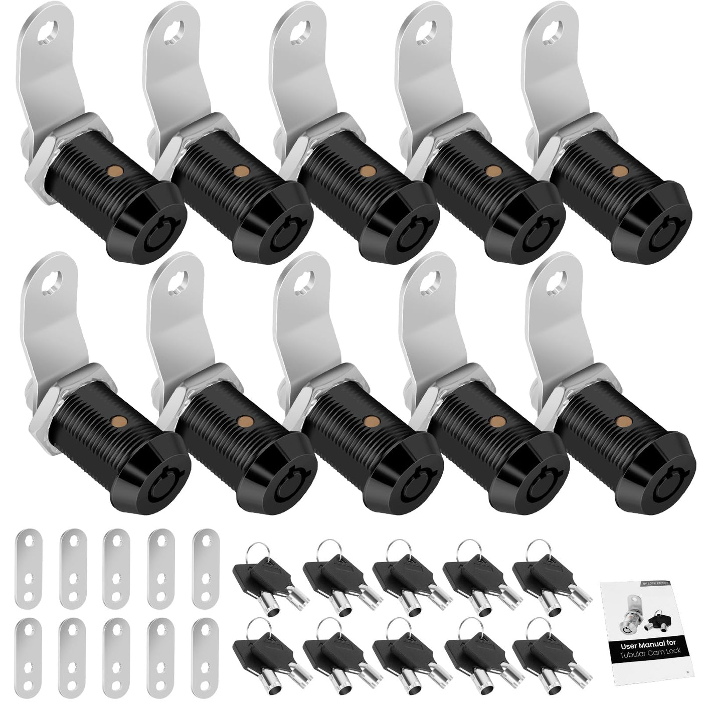 Cylinnda RV Storage Door Locks specialize in security protection keeping your valuables safe and private, help you travel worry free with loved ones! Our RV compartment locks is made of premium zinc alloy, strong , rust-proof and durable. Widely used as replacement locks for RVs, campers, travel trailer, drawers, cabinets, tool boxes, boat storage door. What you get: 10 pack 1 Lock set, Full Set of Rv Cam Locks with 20 same metal keys. If multiple sets are ordered at the same time, all Cam Locks in the order will have Same Keys (Any key can open all locks). Specification: Material: Premium Zinc Alloy, Matte Black Finish Rotation Angle: 90 degree For Door Thickness: Less than 3/4 inch Mounting Hole Diameter: About 3/4 inch ( 19mm) Latching Distance: 1 inch(26mm) Offset Cam Length: 2 inch ( 50mm) Straight Cam Length: Can be used as 2 lengths , 2 inch (50mm) & 1.65 inch (42mm) 100% Quality Commitment & Satisfaction Gurantee: For any reason if youre not satisfied with your purchase, We provide 30-day money back, lifetime warranty and friendly customer service. Customization Service Provided:Currently We provide 5/8 , 7/8 ,1 and 1-1/8 RV storage compartment locks with Chrome&Black Finish for your design. And we also provide Custom Services 1. Different Length Locks to be Key the Same 2. Specific key code Customize 3.Size Inquiry and Installation Guidance Please feel free to contact us via Amazon Message for any questions and custom services.