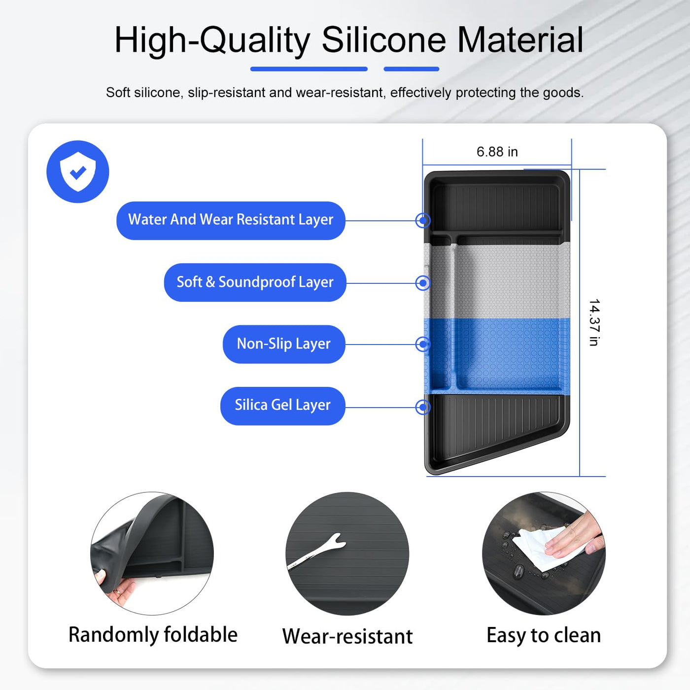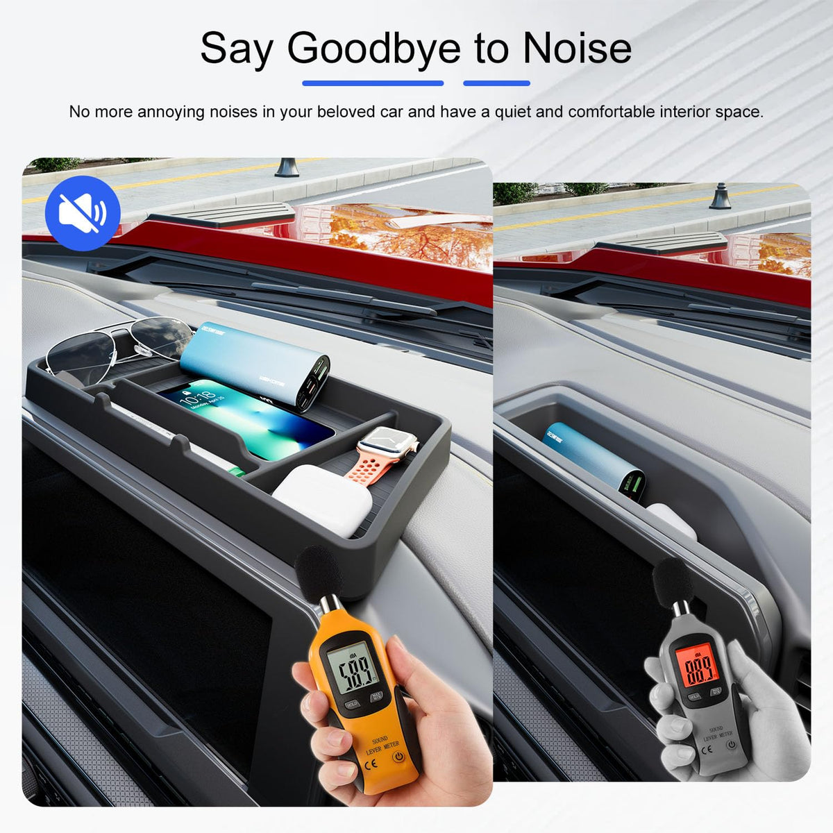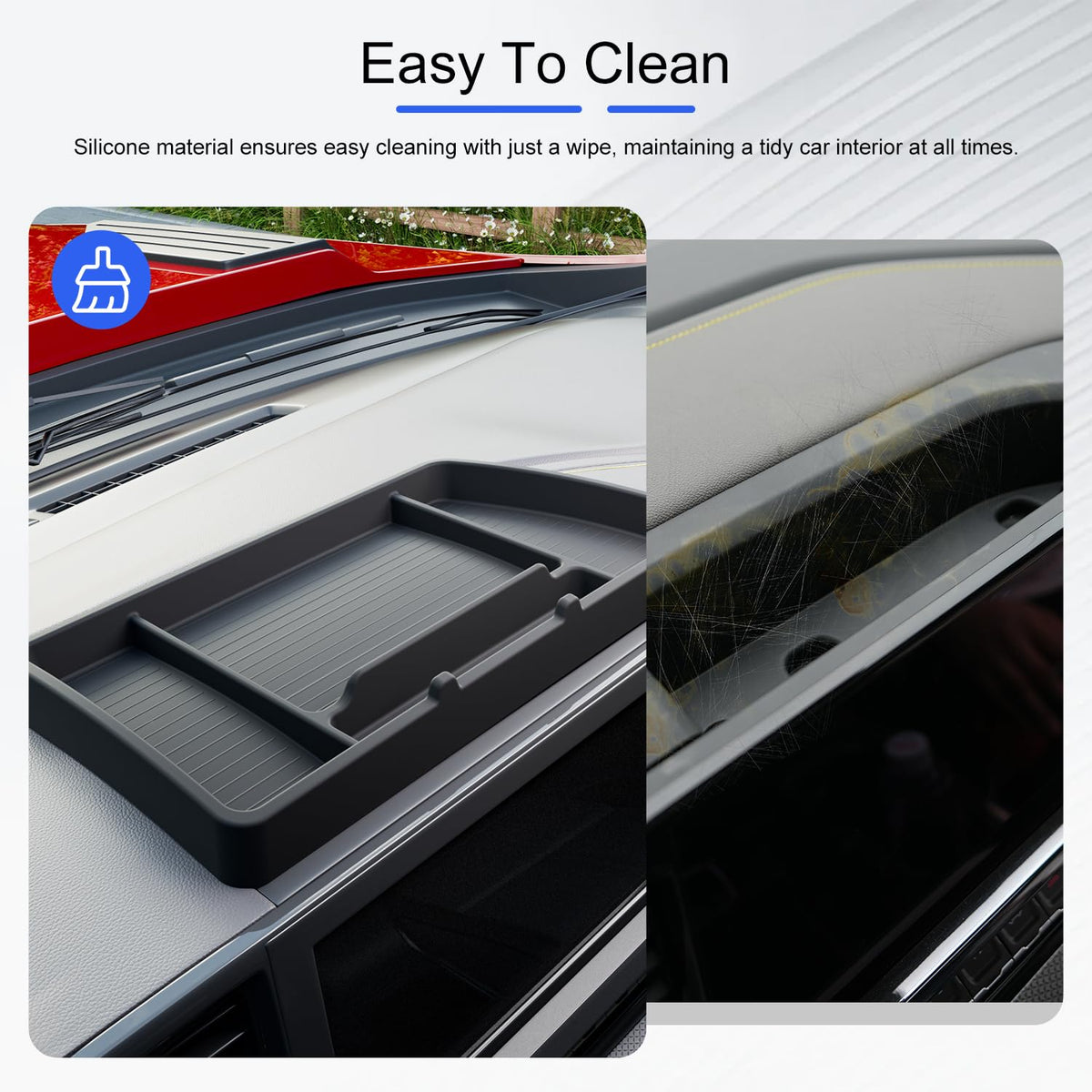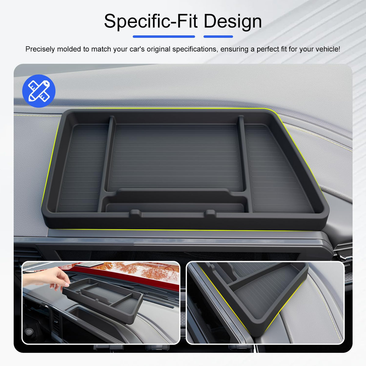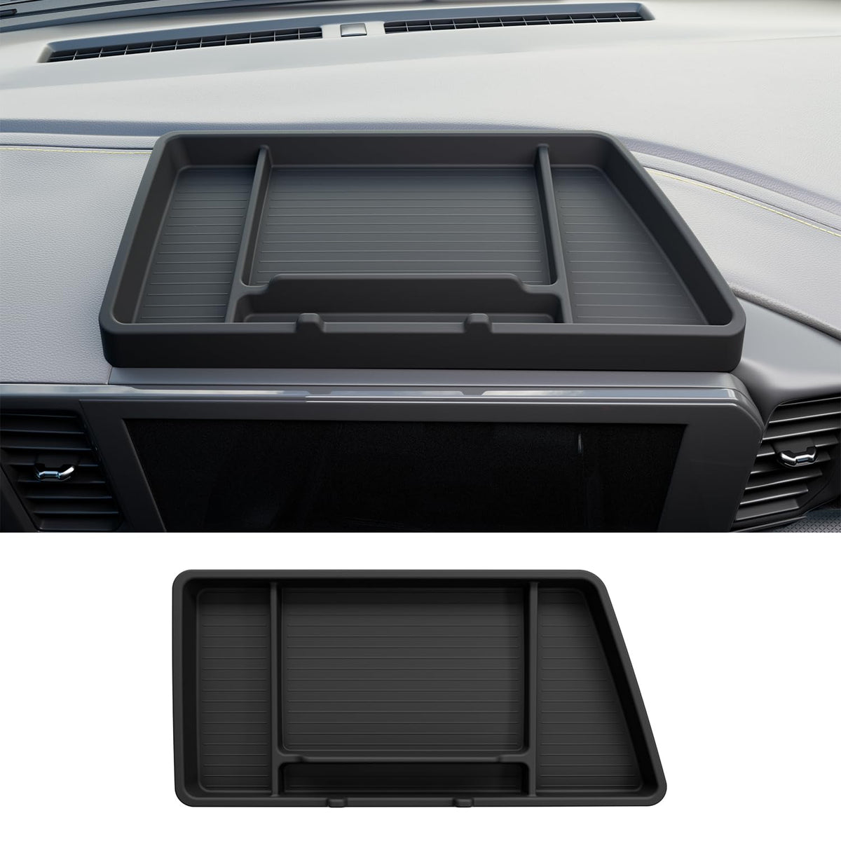 Custom Fitment:The dashboard storage organizer is designed according to the scale of the original car,it is compatible with 2022 2023 2024 2025 Chevy Silverado 1500 GMC Sierra 1500 and also compatible with 2024 2025 Chevy Silverado GMC Sierra 2500HD 3500HD dashboard storage tray.ATTENTION:It only fit 13.4 inches screen.Please check your car year carefully before buying it. Premium Material:The dash storage box compatible with Chevy Silverado dash organizer are made of soft-touch Silicone material.Silicone material is flexible, non-slip material,has no bad smell.It has a strong elasticity, no matter what kind of folding can be quickly restored to the original state. It has a soft touch, and it's water-resistant and easy to clean. Multiple Function:With this storage box replacement for Chevy Silverado dash board tray behind the screen, you could gather small items in the storage box, such as some cards, tape measures, keys, etc. This can prevent these items from sliding inside the vehicle during driving and also reduce noise. The storage pad is made of water-resistant material. Even if there is dust and paper scraps, it only needs to be rinsed with clean water. Easy to Install:Our dashboard storage tray compatible with 2022-2025 GMC Sierra storage box is easy to install.The installation doesn't take much time. Just place the items behind the screen. Satisfied Service:We are here to provide you satisfied service.If you have any questions about center console organizer replacement for 2022 2023 2024 2025 Chevy Silverado GMC Sierra dashboard storage organizer,you could send us an email.
