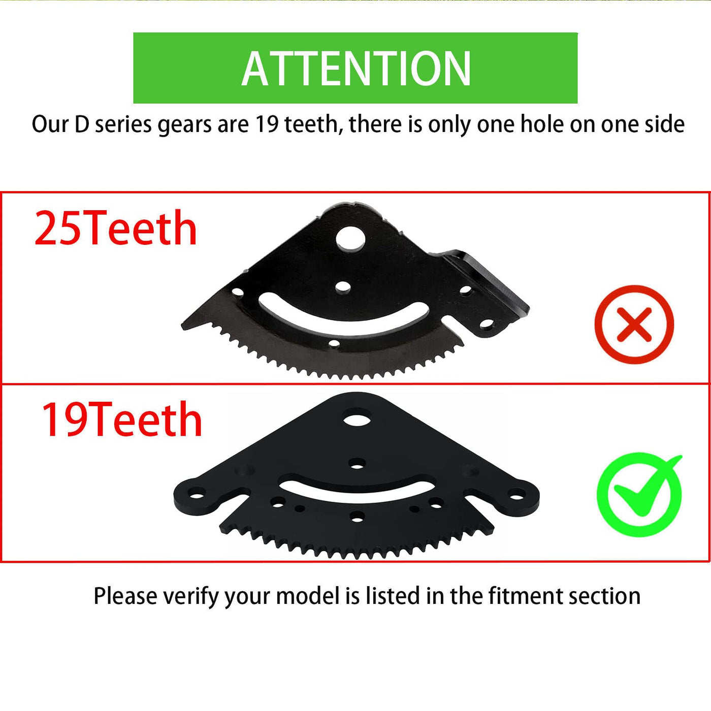 The L and LA mowers do NOT use the same steering sector plate. Our D series gears are 19 teeth and there is only one hole on one side. We strongly suggest comparing the posted picture to your faulty unit.