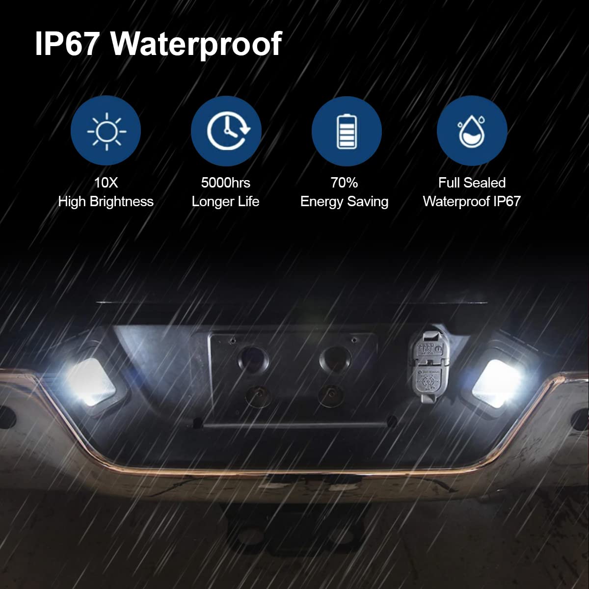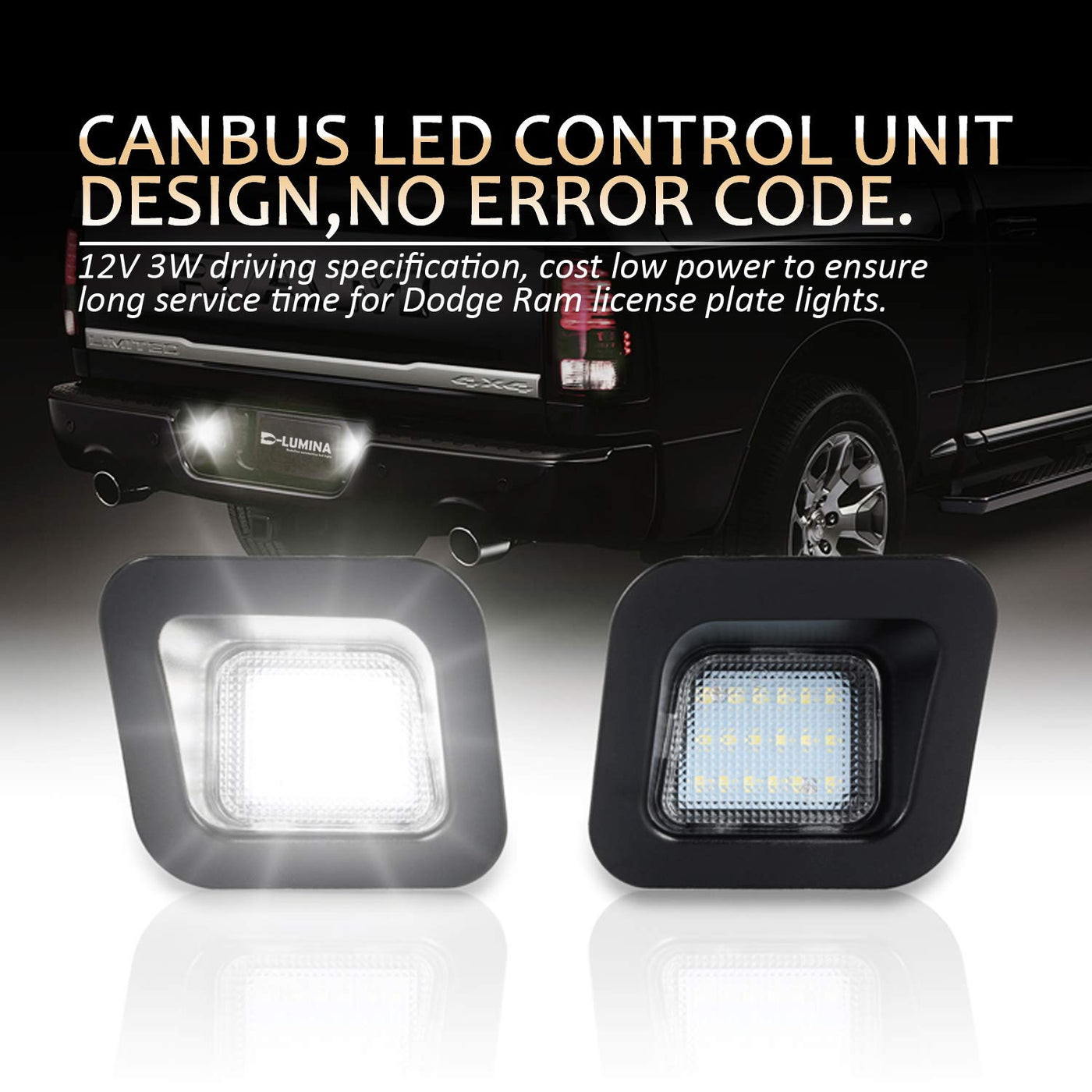 ?Fitment List?: Compatible with 3rd and 4th Gen 2003-2010 Dodge Ram 1500 2500 3500, 2011-2018 Ram 1500 2500 3500. (Will not fit the 2019-UP 5th Gen Dodge Ram) | ?High Intensity LED Chips?: Built with 100% advanced high brightness LED chips with intensity lighting output and low power consumption, which was 10x brighter than factory light bulbs, dramatically improved the lighting on rear license plate visibility and safety while driving at night. Direct upgrade replacement part to replace the old or defective OEM license plate lights. | ?High Quality Performance?: These license plate lights are much brighter than stock lights. Built-in high power 18 SMD LED chips, made of PC/ABS plastic lens and housing processed with ultrasonic treatment, 6000K white bright lights output maximize illumination and IP68 rated waterproof. Canbus LED control unit design, no error code. | ?Easy Installation?: Plug and Play insert to install in just minutes, Non-polarity sensitive, OEM Perfect fit and direct replacement, no modification or trimming needed. Remove original T10 bulbs and insert the upgrade version lights plug into the factory socket. | ?Package Including?: 1x pair of right and left side LED license plate lights. Product Come with lifetime support to Ensure 100% Satisfaction.