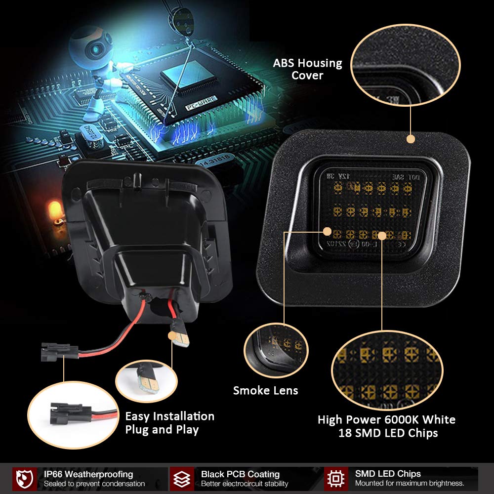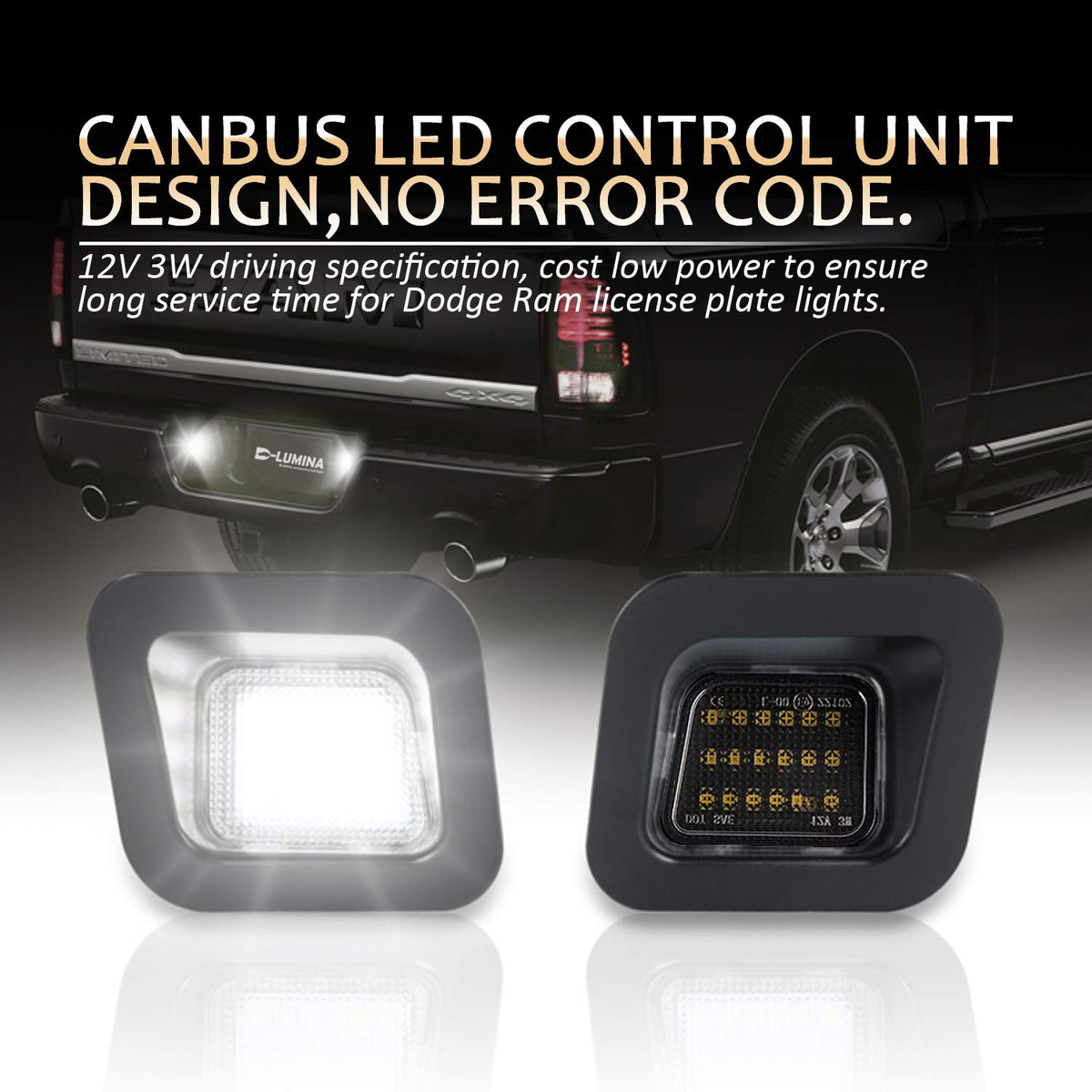?Fitment List?: Compatible with 3rd and 4th Gen 2003-2010 Dodge Ram 1500 2500 3500, 2011-2018 Ram 1500 2500 3500. (Will not fit the 2019-UP 5th Gen Dodge Ram) | ?High Intensity LED Chips?: Built with 100% advanced high brightness LED chips with intensity lighting output and low power consumption, which was 10x brighter than factory light bulbs, dramatically improved the lighting on rear license plate visibility and safety while driving at night. Direct upgrade replacement part to replace the old or defective OEM license plate lights. | ?High Quality Performance?: These license plate lights are much brighter than stock lights. Built-in high power 18 SMD LED chips, made of ABS plastic housing and smoke lens, 6000K white bright lights output maximize illumination and IP68 rated waterproof. Canbus LED control unit design, no error code. | ?Easy Installation?: Plug and Play insert to install in just minutes, Non-polarity sensitive, OEM Perfect fit and direct replacement, no modification or trimming needed. Remove original T10 bulbs and insert the upgrade version lights plug into the factory socket. | ?Package Including?: 1x pair of right and left side Smoke Lens LED license plate lights. Product Come with lifetime support to Ensure 100% Satisfaction.