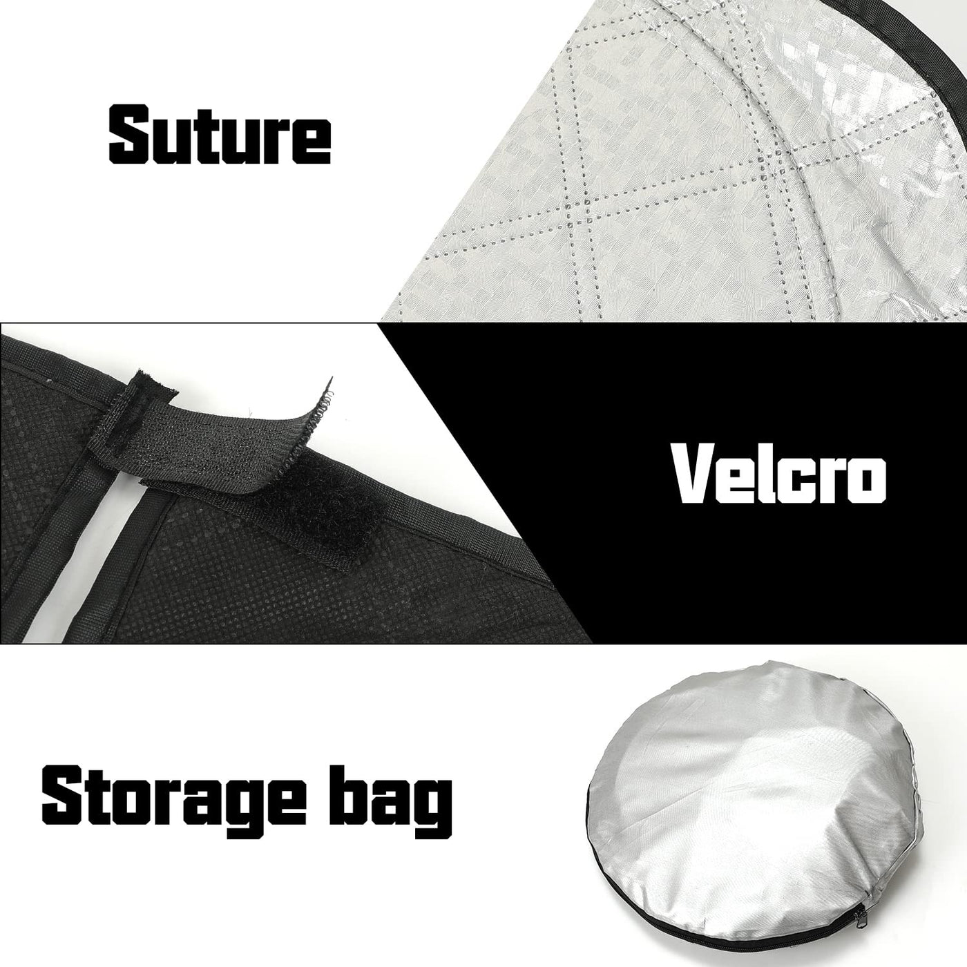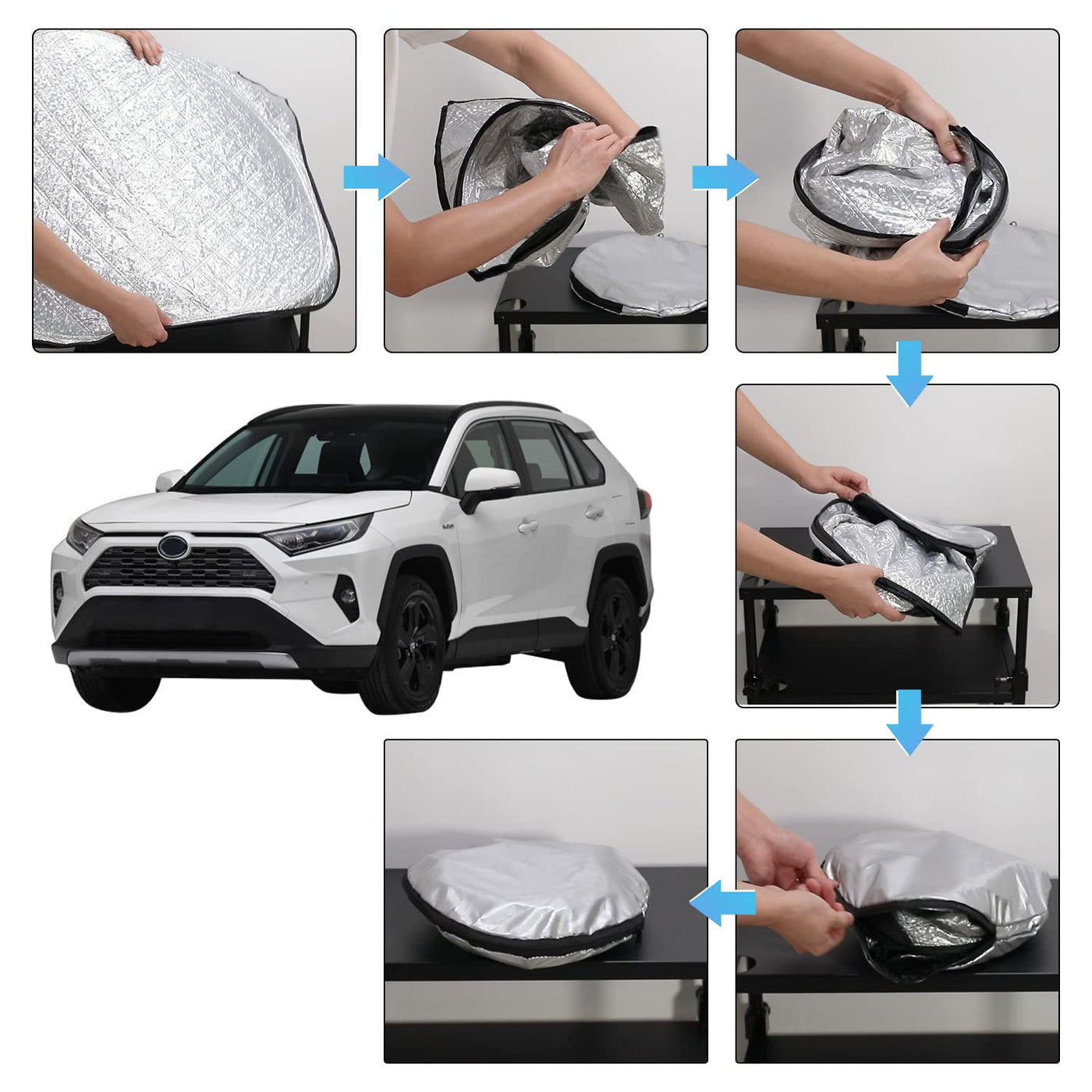 NOTE:The Sliver side is OUTWARD,while Black side is INWARD Double reduce the temperature of your car,effective saving energy. Reduce the inside temperature noticeably by blocking a lot of heat and harmful UV rays out. Keeping steering wheel,dash and seat cover from becoming scorching hot and fading. Covers Every Edge of Your Windshield Our Windshield sun shade is during to your original windshield size,can perfect covered your car Windshield with no gap. This Sun Visor is easy to fold and store which really takes up a tiny amount of space. Reflect the UV rays,Infrared rays and heat so as to prevent the sun rays from sneaking in and make your car interior cooler. Very Easy to Install and Put Away in Seconds. Easy to use simply unfold and position. Especially it can accomodate the mirror space,securing safe driving experience. With elastic memory steel wire,folding windscreen sun shade take up so much less space.