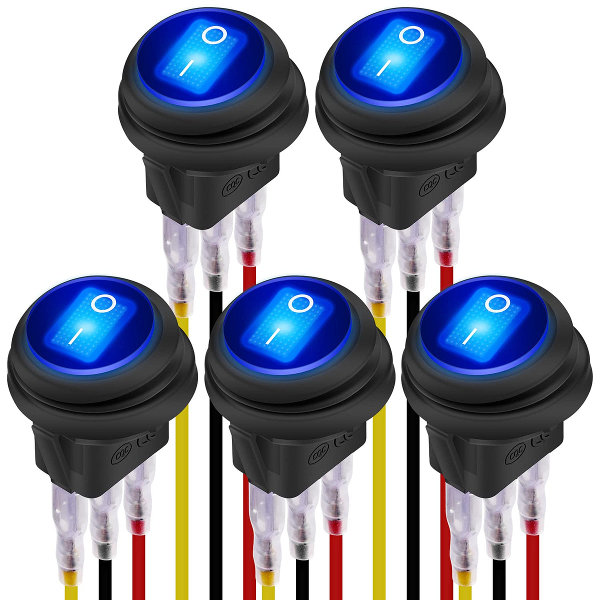 Daiertek 12V 20A Waterproof Rocker Switch Blue Led Lighted Round On Off 3 Pin 12 Volt Weatherproof Illuminated Toggle For Marine Car Rv Truck -5Pack