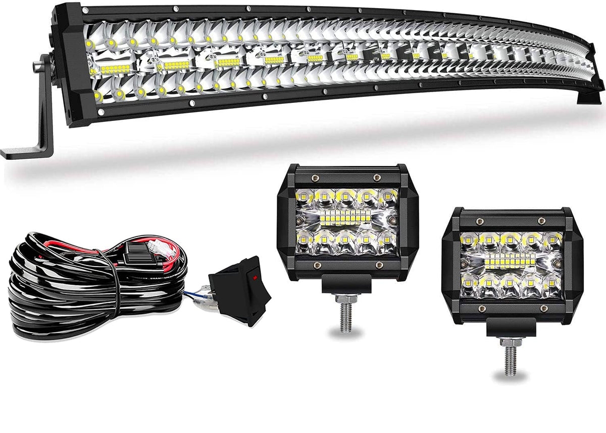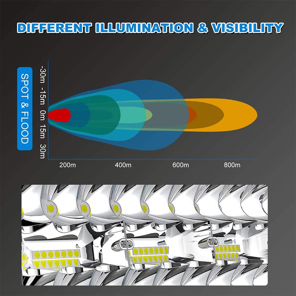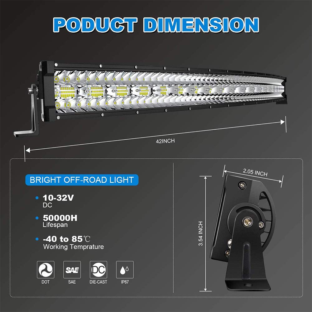 ?SUPER BRIGHT?The LED bar with triple row chips,delivering 6000k bright cool white light, Perfect combination of spot and flood beam for long irradiation distance,flood beam for broad view area, combo beam provide excellent visual effect,keep bright surround lighting in wider range. | ?GREAT PERFORMANCE?Die-cast aluminum housing for strength and durability. Upgrade PC lens surface with high light transmission, IP67 rated waterproof, great performance of waterproof, dust-proof, shockproof and anti-corrosion in extreme weather condition. | ?BETTER HEAT DISSIPATION?High-quality heat conduction silicone gel together with redesigned aluminum alloy housing, providing superior cooling effect for long for better cooling effect, which extend the lifespan to over 50,000 hours. | ?WIDE APPLICATION?Universal Mounting Brackets are included, easy set up to any mounting holes and openings with standard base mounts,can be applied to any kind of cars. | ?PACKAGE INCLUDES?1 x 42inch 900W LED Light Bar,2 x 4inch LED Pods Light , 1 x Wiring Harness Kit with Switch,Necessary mounting hardwares and brackets,1 Year Warranty and Friendly Customer Service.