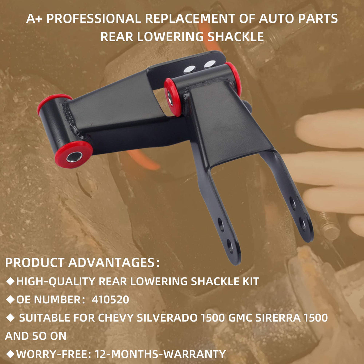 Q: What are the main features of this lowering shackle kit?A: This lowering shackle kit features a replacement part number of 410520 and includes two rear lowering shackles and two screws. It is designed for easy installation and provides a lower ride height for improved handling and aesthetics.