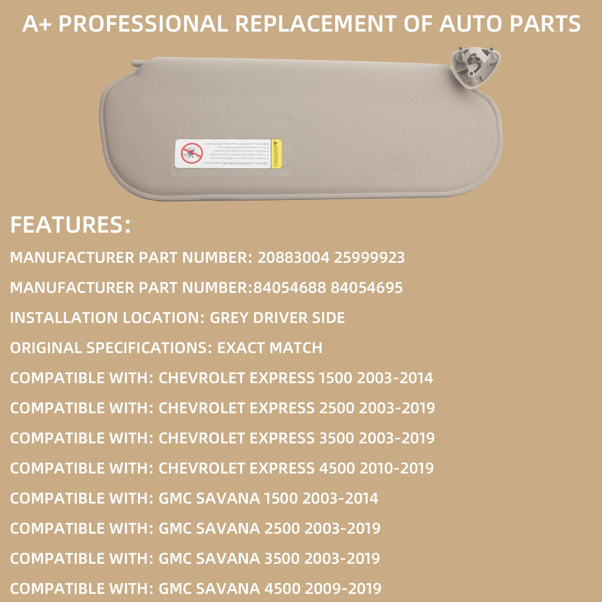 Q: Is this sun visor compatible with my Chevrolet Express or GMC Savana model?A: Yes, the Dasbecan Gray Left Driver Side Sun Visor is designed to be compatible with Chevrolet Express and GMC Savana models from 1999 to 2019. Please refer to the specific OE replacement numbers (84054688, 84054695, 20883004, 25999923) to ensure proper fit.