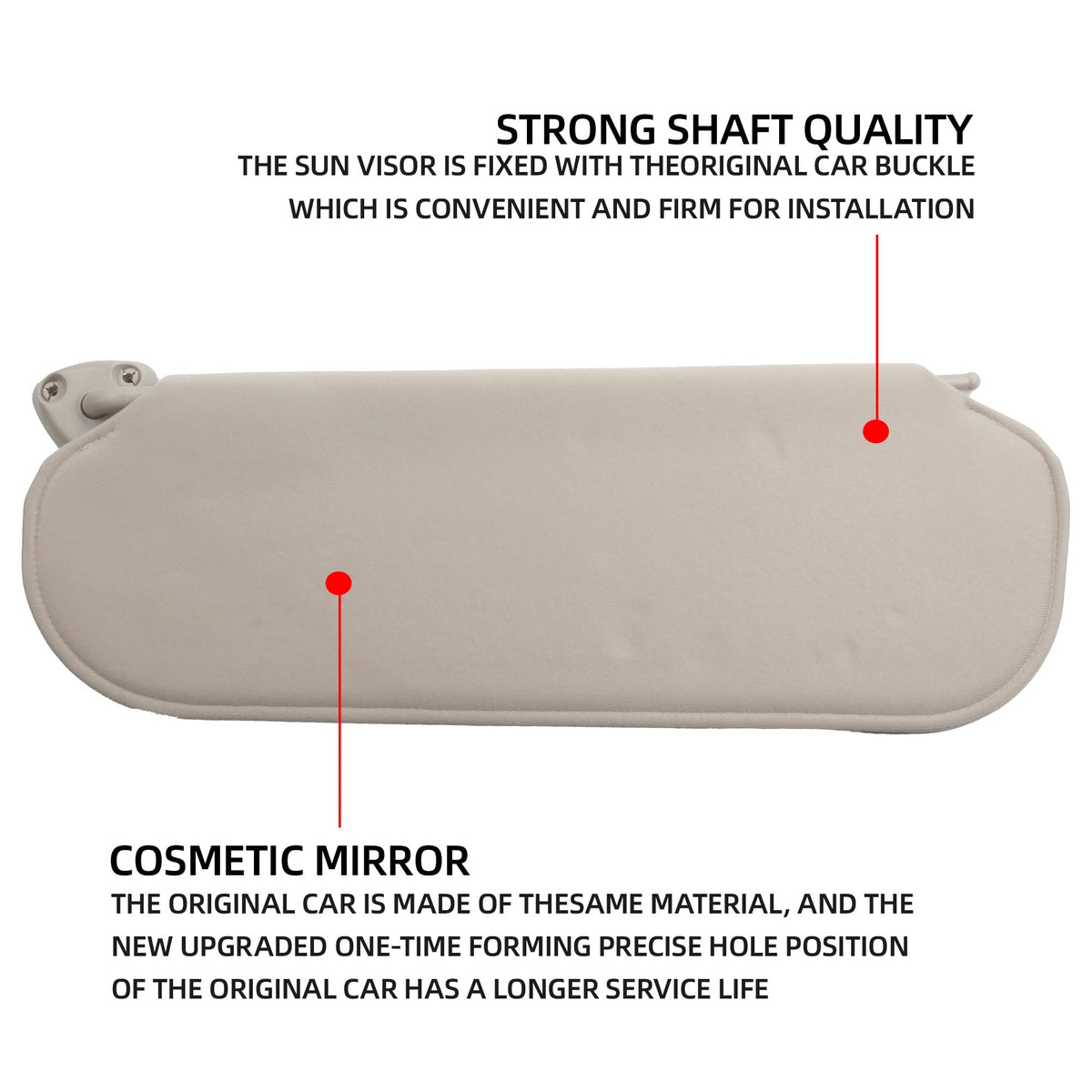 Q: What is the color of the Dasbecan Left Driver Side Sun Visor?A: The Dasbecan Left Driver Side Sun Visor is available in a sleek gray color, designed to match the interior of your Chevrolet or GMC vehicle seamlessly.