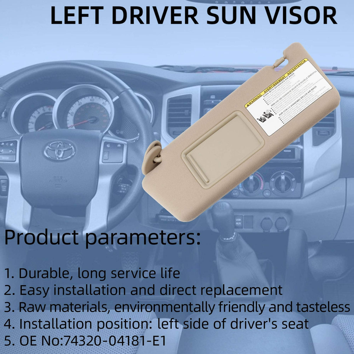 Product Name: Left Driver & Right Passenger Side Sun VisorColor: BeigeRaw Materials:ABS Reinforced Plastic Stretch CottonProduct Type:Without Interior Light and SwitchAll models can be adapted, the lighting function is determined according to the original car configurationPackage List :Right Passenger Side Sun Visor x 1PCLeft Driver Side Sun Visor x 1PCInterchange Part Number: 74320-04181-B1, 74320-04180-B1, 74310-04081-B0,74320-04180-B0Features: OE Replace Number:74310-04081-B0, 74320-04180-B0,74320-04181-B1 Installation Location:Passenger Side Sun Visor Vehicle Compatibility: Tacoma 2005-2012Original Specifications, Exact Match12-Months Waranty With Worry-Free ExperienceVehicle Adaptation List:Toyota Tacoma 2005 2006 2007 2008 2009 2010 2011 2012 2013 2014 2015