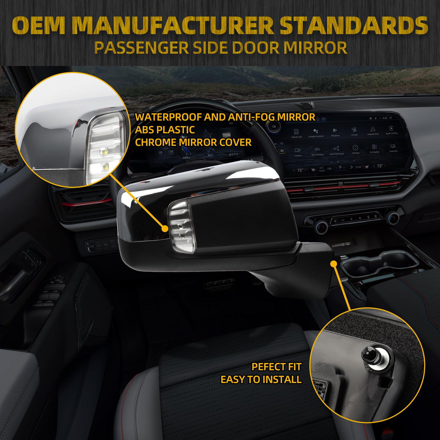 ?Comaptible With?The Passenger Side Mirror Compatible With 2019 2020 2021 2022 2023 2024 Chevrolet Silverado 1500 | ?Superior Material ?Chrome Cover; The Right Side Mirror Is Consist Of Superior ABS Plastic Cover And High-Temperature Resistant Glass; Waterproof And Anti-fog, Enduring Structure | ?Part Number?The Part Number Of Right Mirror Is GM1321586, 84823222; Please Confirm Your Vehicle Model And Part Number Before Purchase | ?Feature?The Right Rear Mirror Is Equipped With Power Heated, Manual Folding, LED Turn Signal, Blind Spot And Temperature Sensor | ?Note?9 Pins, Plug and Play, No Needs For Other Accessories, Easy Installation With a Few minutes; Save Time and Money
