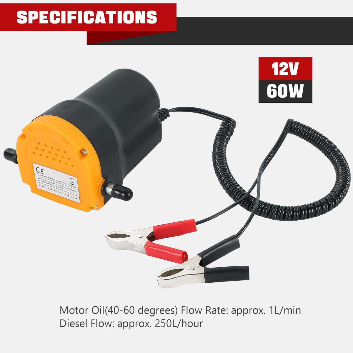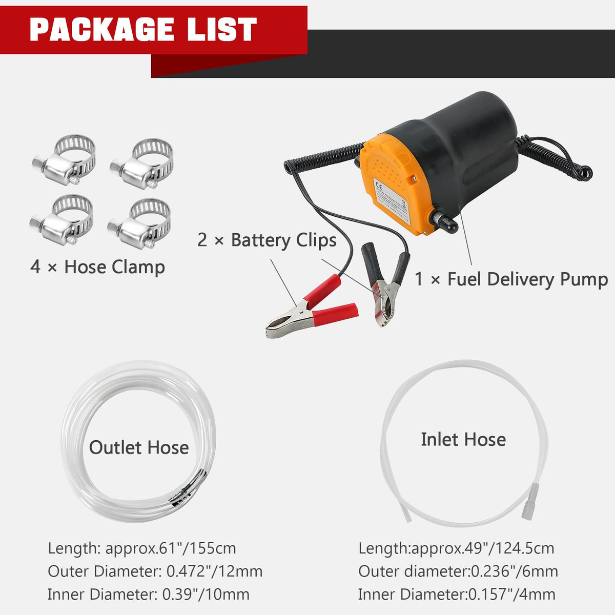 Q: What comes included in the package with the pump?A: The package includes 1 oil pump, 2 outlet hoses, 2 inlet hoses, 4 hose clamps, and 2 battery clamps, providing everything you need for a clean and efficient oil change.