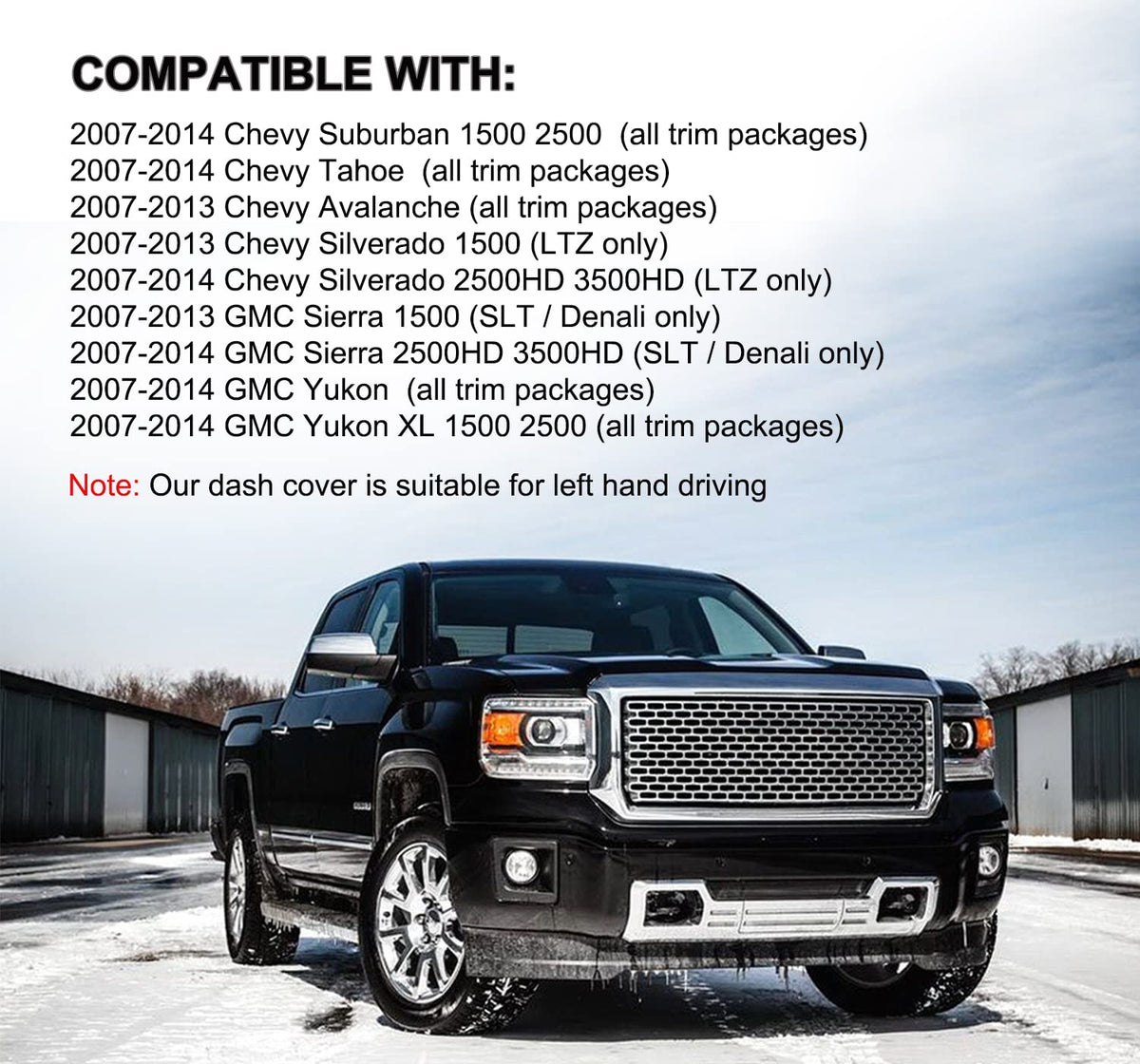 Q: Is this dashboard cover compatible with my vehicle?A: Yes, the YIZ Dash Cover is specifically designed to fit 2007-2014 Chevy Tahoe, Avalanche, Suburban, 2007-2014 GMC Yukon XL Denali, and 2007-2013 Chevy Silverado (LTZ ONLY). Please check your vehicle's model to ensure compatibility.