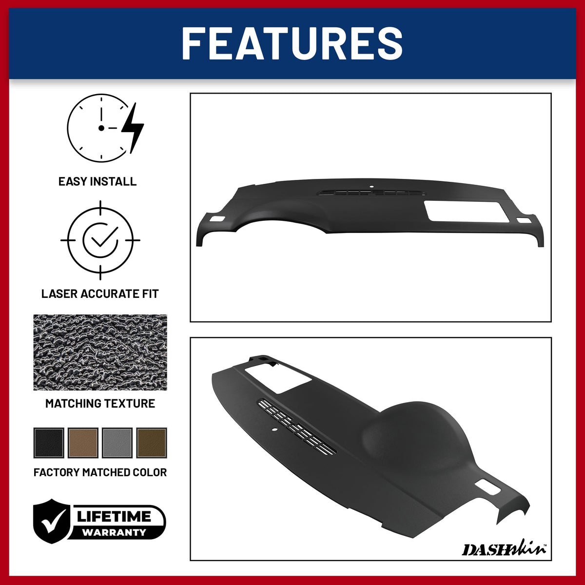 Q: Is the DashSkin Dash Cover durable?A: Yes, the DashSkin Dash Cover is made from high-quality molded ABS plastic, designed to provide strength and durability. The workmanship of the cover is warranted for life against cracking, warping, and other defects, ensuring that your investment is protected.