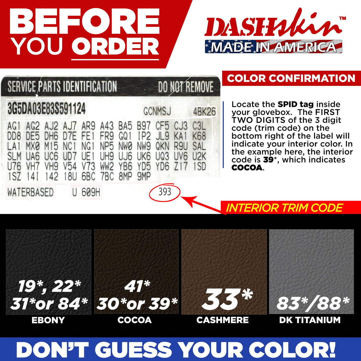 Q: What colors are available for the DashSkin Dash Cover?A: The DashSkin Dash Cover is available in a factory-matched black color, specifically designed to blend seamlessly with your vehicle's interior. For assistance in selecting the correct color for your vehicle, refer to the product images for guidance.