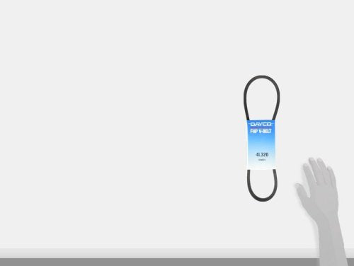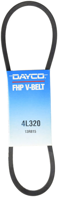 Q: What are the dimensions of the Dayco 4L320 V-Belt?A: The Dayco 4L320 V-Belt has package dimensions of 1.27 H x 34.798 L x 9.398 W centimeters.