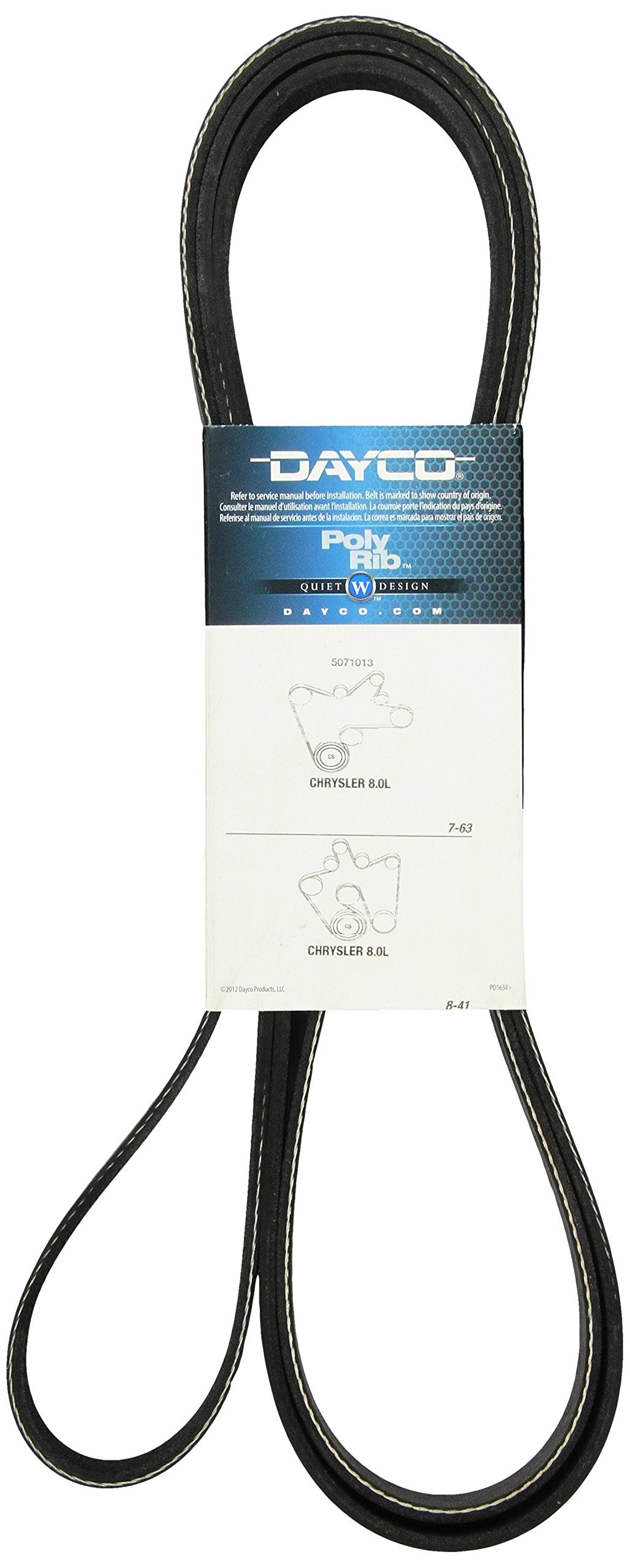 Q: What vehicles is the Dayco 5071013 Serpentine Belt compatible with?A: The Dayco 5071013 Serpentine Belt is designed to fit a variety of vehicles. It is important to check the compatibility with your specific make and model before purchasing. Refer to your vehicle's manual or consult with a professional for the best fit.