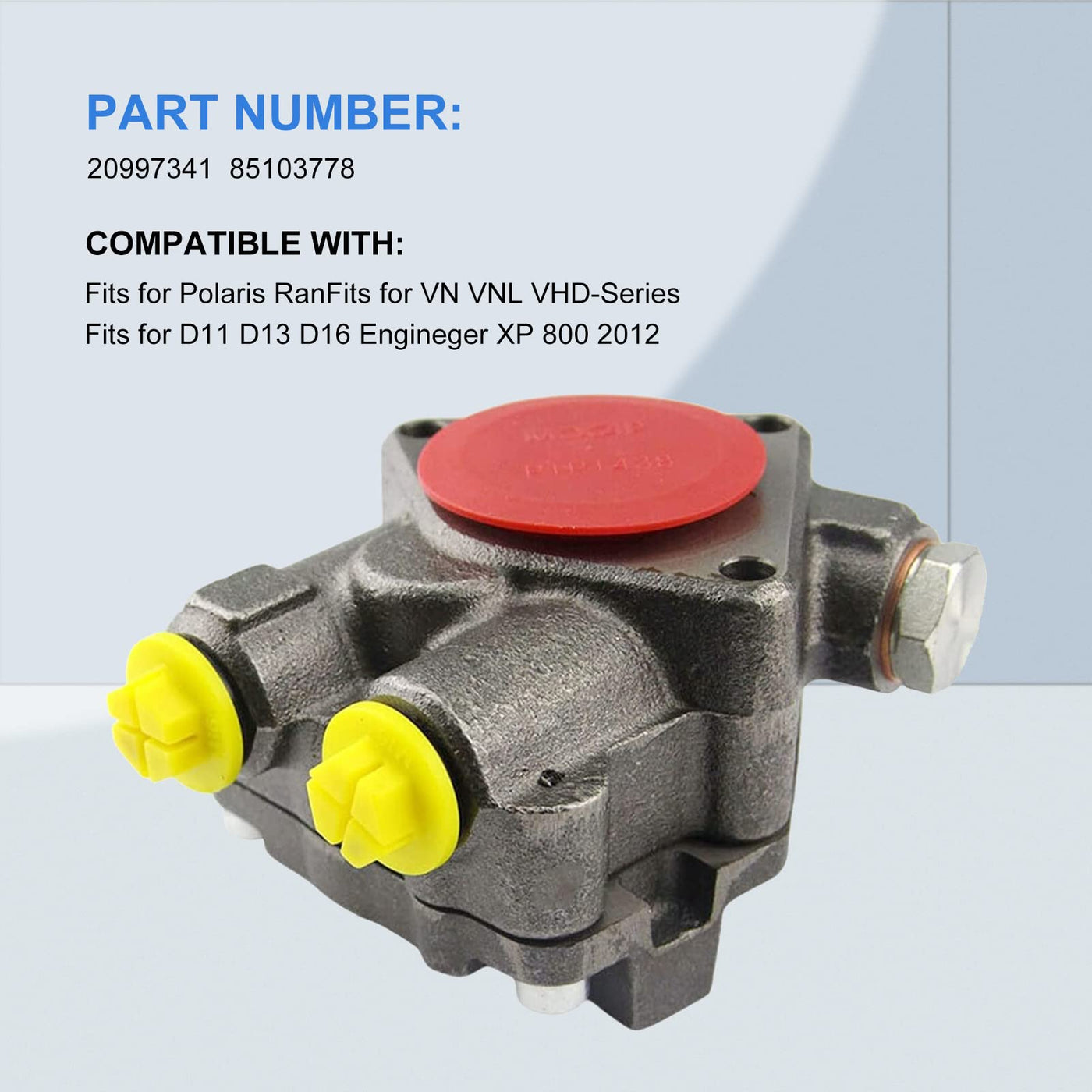 Part Number: 20997341 85103778 Product Condition: New Package Include: 1 Fuel Pump Applicable Models: Fits For Vn Vnl Vhd-Series Fits For D11 D13 D16 Engine Product Features; Made Of High-Quality Metal Materials, Stable Performance, High Reliability; Strong And Durable, Easy To Install, Fast Response, Close To The Previous Effect; But Be Careful When Installing And Testing, Otherwise It Will Cause Damage To The Parts; Note; Please Make Sure That The Model Number, Part Number And Photo Is The Same As Yours Before Order. We Recommend Professional Installation When You Are Not Familiar With It. If This Item Can Not Work Properly For You, Please Contact Our Customer Service.(Please Do Not Rush To Return The Project) Delivery Details; The Product Will Be Carefully Checked Before Shipment. Please Offer Correct Address And Contact Information. Should Any Delay Happen Due To Logistic Company And Local Customers Or Duties Will Inform You. The Buyers Are Supposed To Be Charged For The Possible Additional Cost Such As Import Taxes And Customs Duties. Daysyore Will Try To Assist You For Your Requirement. Any Special Requirements For Declared Values, Please Inform Us Before Shipment. Our Advantages: We Have A Professional Technical Team, Provide High-Quality Products And Excellent After-Sales Service.