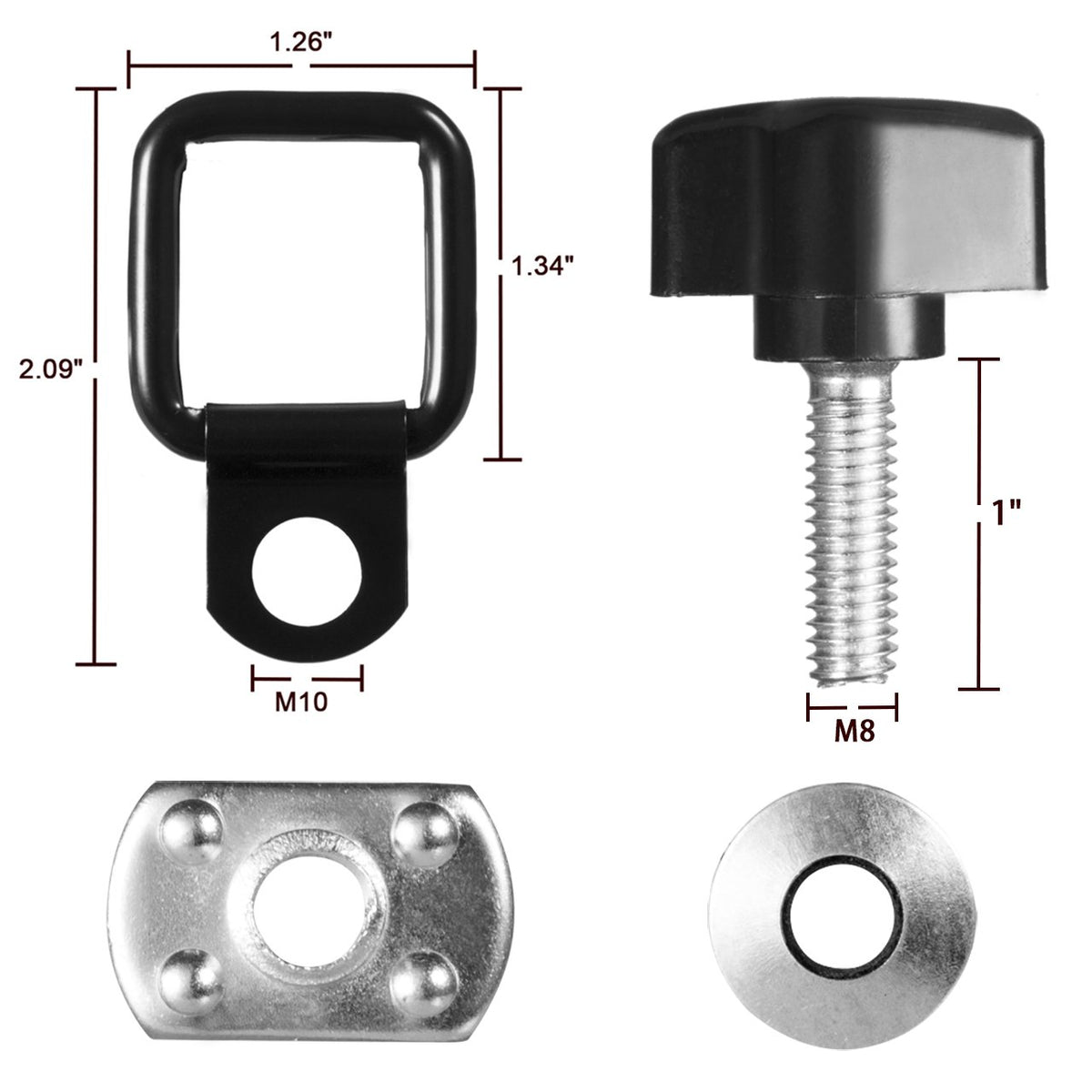 Description:Dedc Hardtop Quick Removal Fastener Thumb Screws And Tie Down D-Rings Anchors Combo Setfeatures:The Thumb Screw M8 25Mm Make Taking The Top Off The Hard Top A Lot Easier And Faster!Anti-Corrosion.Thumb Screws Are Made Of Durable Nylon Hurricane Styled Head With Solid Steel Stud.The Nuts Are Made Of Galvanized Steel.D Ring Tie Downs Add Anchor Points For Anchoring The Cargo Net Or Straps, Make Cargo Will Be More Fixed And Safer, Tidying Up The Trunk Area.They Are Fitting For All 1995-2016 Yj Tj Jk Jku Sports Sahara Freedom Rubicon X Unlimited X 2 Or 4 Doorpackage Content:8 X D-Ring Tie Downs:8 X Quick Remove Thumb Screws:8 X Nuts And 8X Washers.(You Only Need 6, 2 Sets For Extra Backup.)Package Information:Package Size: 10*5*5Cmpackage Weight: 266G