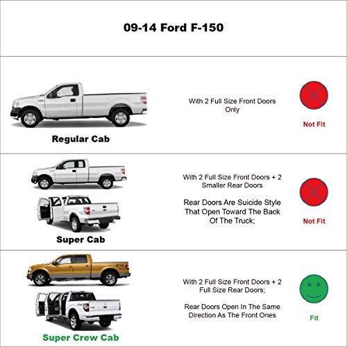 Fitment: 2009-2014 F-150 SuperCrew/Crew Cab Only *Note:The super crew cab has four full size doos that open in the same directions. Item-offered: 4pcs Wind Deflector window visors (Installation instruction is not included,please check the sample installation picture above for reference) Style: Tape-On Style (Stick on to the door & above the windows.Not In-Channel Style) Installation: Direct Tape-On Design,Easy Peel-N-Stick Installation.No Cutting or Drilling Required Material: Reinforced Acrylic Item-Function: * 100% Brand new.New used or installed * Comes With 3M Automotive-Grade Double-Sided Tapes.Easy Installation. * Help reduce heat buildup in park vehicles by allowing air in when partially open. * High quality material to withstand the rigors of the elements. * Dramatically Improve Styling & Appearance.