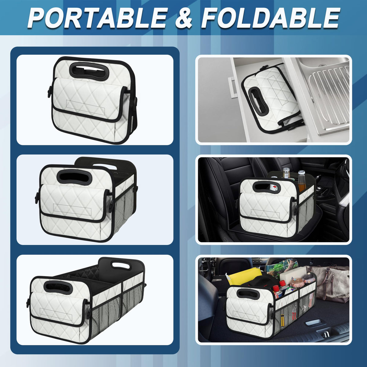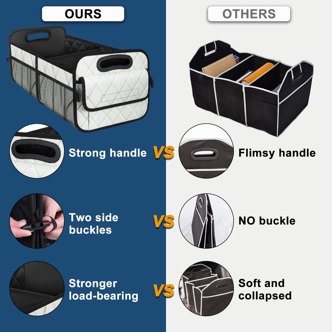 ?About the material?: This car trunk organzier with 600D waterproof material (durable, dirt-resistant and wear-resistant) is used to ensure the waterproof effect and easy to clean. | ?Car organziers and storage?: 22 in*12.5 in*10.75 in (54.5*32*27.5cm), the capacity of about 50L can meet your needs for organizing and storing items in daily life. | ?About design?: More concise product design, more durable new materials, integrated cutting and sewing process, three-dimensional appearance, more durable and wear-resistant in actual use. | ?Trunk organzier for car/suv?: Whether it is a car, a suv or a truck. Fully meet the needs of the vehicle's sundries storage and arrangement in various life scenarios. | ?A multifunctional assistant?:It is not only used for car storage organizer(as car accessories), but also can be a storage box for daily life!It can not only meet your storage and organization needs in car use scenarios. You can even use it for household sundries, such as books, clothing, and tools. It can also play a role when you are packing up office papers, stationery.
