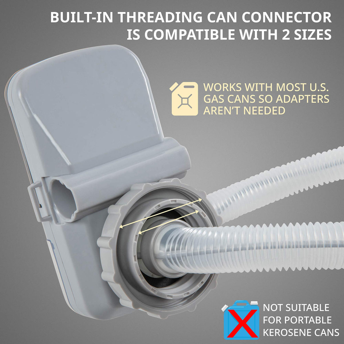 Q: Is the pump compatible with all types of fuel cans?A: The Deway pump includes a universal adapter that fits most standard gas cans, allowing for no-spill siphoning. However, it is important to note that the adapter may not fit certain US kerosene cans.