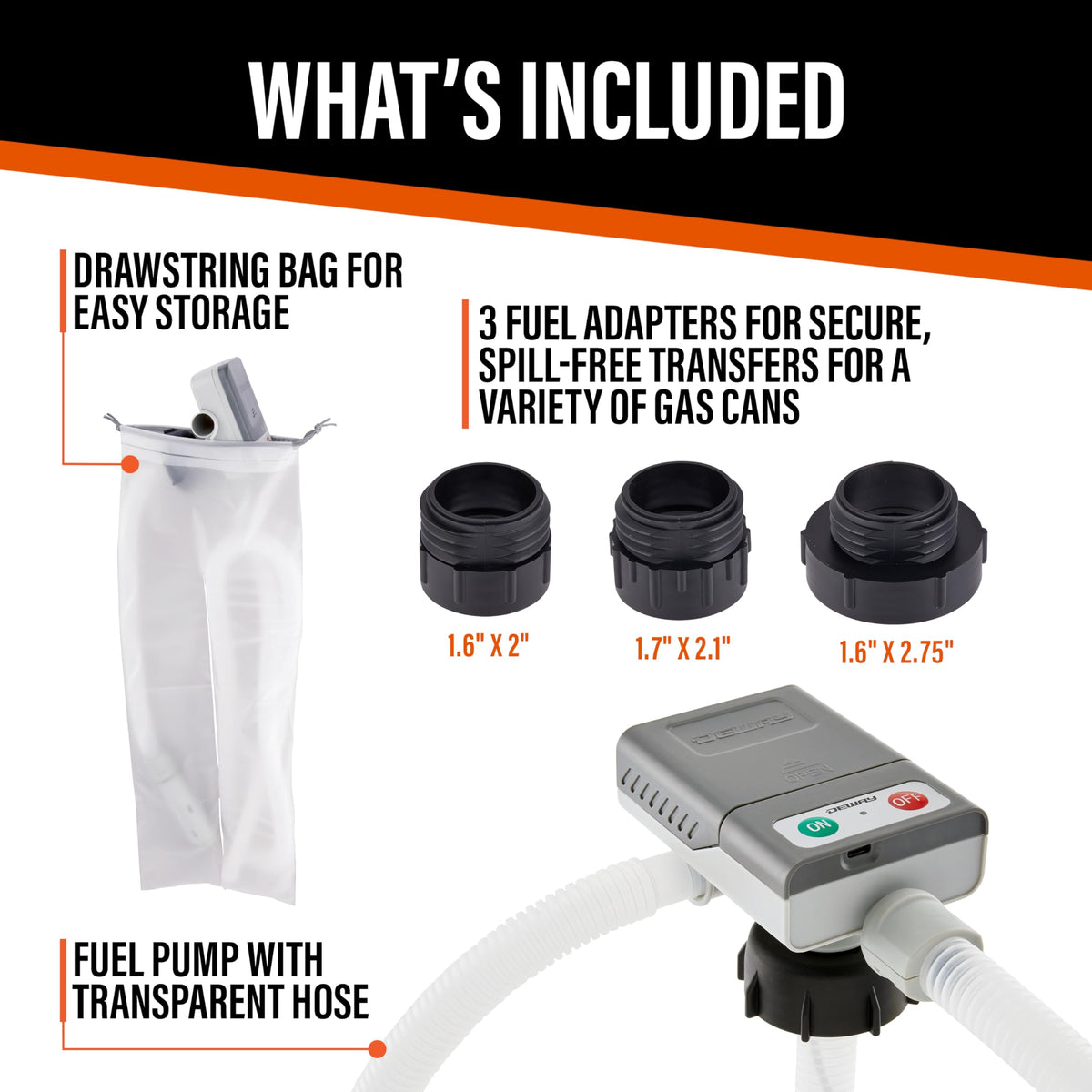 Small pump. Big siphoning action! Wish you could ensure every last drop of fuel arrives safely at its destination? Enter the DeWay Fuel Transfer Pump for Gas Can! An answer to the timeless problem of slow manual hand pumps, leaky hoses, imprecise nozzles, and back-breaking manual fill-ups, this handy little system stores discreetly in your work truck, emergency auto kit, or garage cabinet for many years of precise, effortless gas transfer. Use your pump at the auto shop or garden center for emptying and filling fuel tanks and lawn equipment in a flash. Keep one around the house for cleaning aquariums, clogged sinks, and stopped-up tubs. And store one in your personal vehicle for those unfortunate times you find yourself stranded on E. From gasoline, kerosene, and diesel to chemical acids, non-potable water, and other liquids youd rather not touch-theres no better way to drain! Explore the endless advantages of our latest fuel transfer pump lineup.