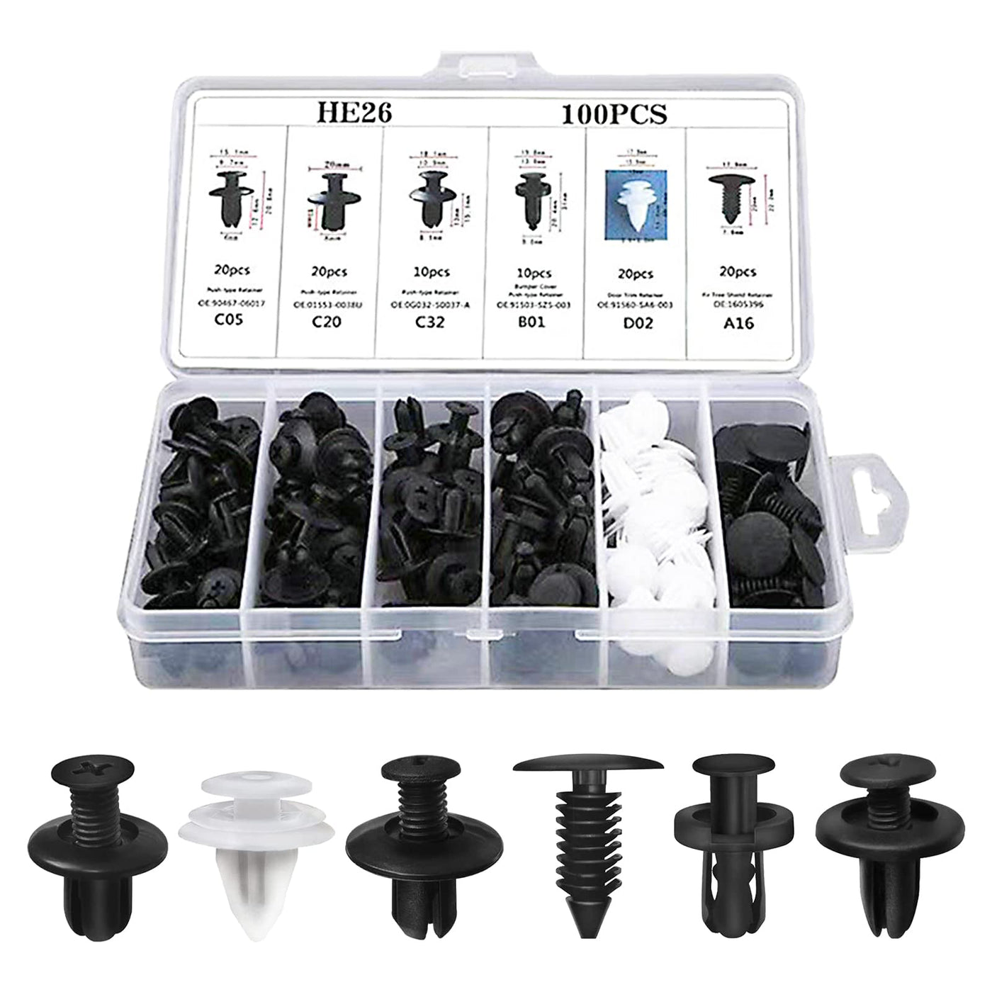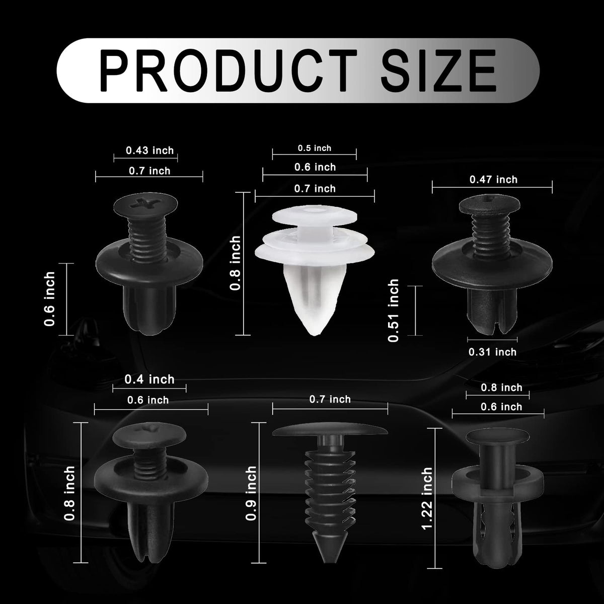 Q: What sizes of clips are included in the Dewkou Bumper Retainer Clips kit?A: The Dewkou 100 PCS Car Bumper Retainer Clips kit includes six different stud rivet sizes: 6.3 mm (1/4 inch), 8 mm (5/16 inch), 9 mm (23/64 inch), and 10 mm (25/64 inch), ensuring compatibility with various vehicle models.