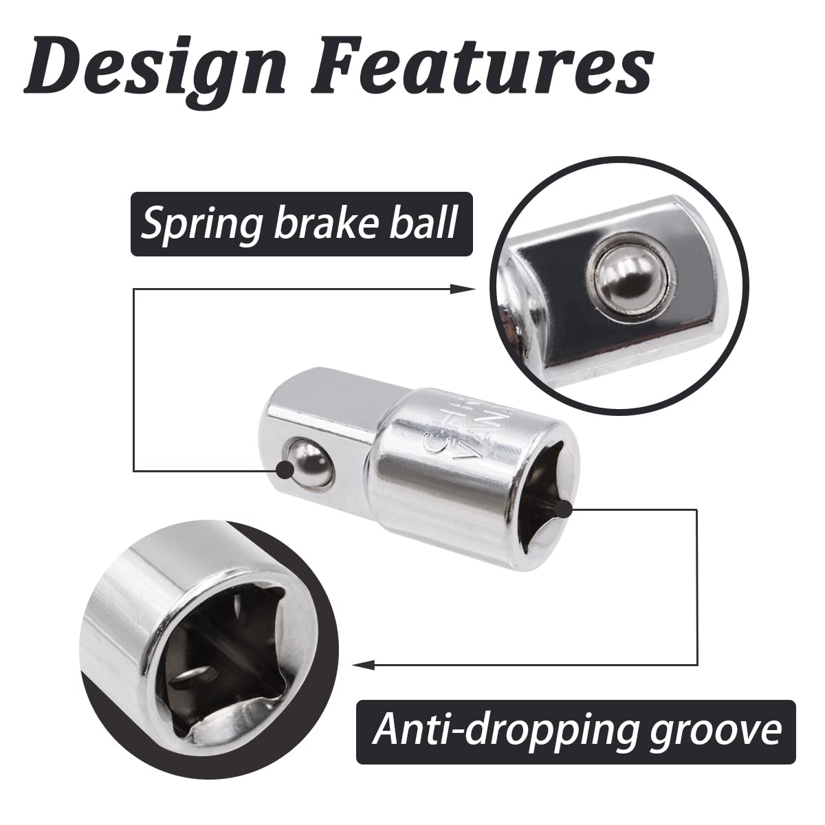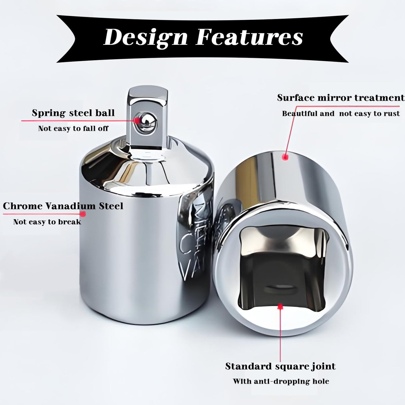 Q: How does the locking mechanism work on these socket adapters?A: The adapters feature a spring-loaded brake ball design that firmly locks the socket in place, preventing any sliding during use, which enhances safety and efficiency.