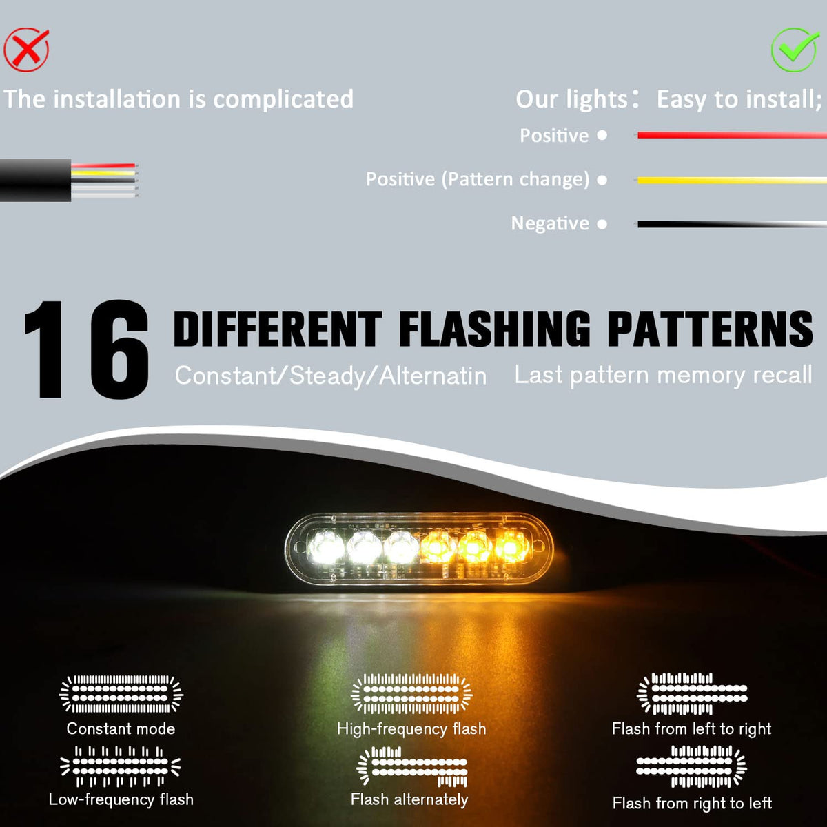 Specifications: - Voltage: 12V-24V - Wattage: 18W( 3W/Led ) - Led Light Color: Amber White - Color: Black Housing + Clear Lens - Number Of Led: 6 X Led/Light - 3 Wires Connection: Black For Negative, Red For Positive, Yellow For Positive For Pattern Change. Fitment: - Universal Fit All Car Suv Vans And Trucks With Dc 12V-24V. Note: - Only If You Connect The Light To The Brake Light That Can Have Strobe Light Patterns. - Please Also Connect The Red And The Yellow Wire To The Brake Light First To Active The Light, Then Turn Off The Car And Connect Red To Positive And Black To Negative Again. - Modification May Required For Some Models. - Professional Installation Is Highly Recommended. Package Included: 8 X Ultra Slim 6 Led Car Strobe Flash Lights 8 X Protection Pad