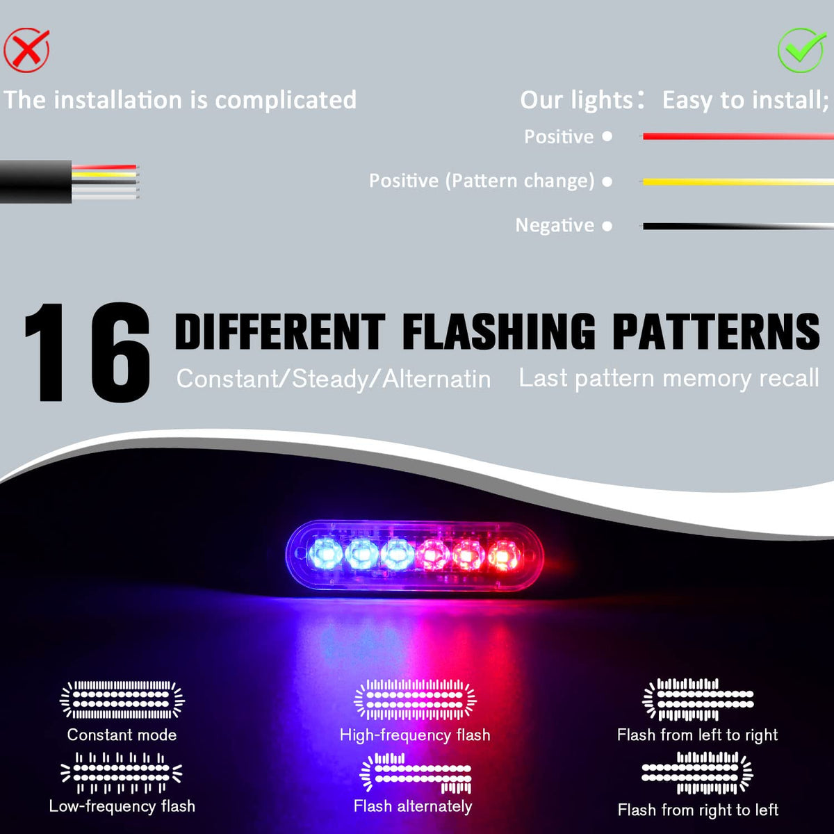 Specifications: - Voltage: 12V-24V - Wattage: 18W( 3W/Led ) - Led Light Color: Red Blue - Color: Black Housing + Clear Lens - Number Of Led: 6 X Led/Light - 3 Wires Connection: Black For Negative, Red For Positive, Yellow For Positive For Pattern Change. Fitment: - Universal Fit All Car Suv Vans And Trucks With Dc 12V-24V. Note: - Only If You Connect The Light To The Brake Light That Can Have Strobe Light Patterns. - Please Also Connect The Red And The Yellow Wire To The Brake Light First To Active The Light, Then Turn Off The Car And Connect Red To Positive And Black To Negative Again. - Modification May Required For Some Models. - Professional Installation Is Highly Recommended. Package Included: 8 X Ultra Slim 6 Led Car Strobe Flash Lights 8 X Protection Pad