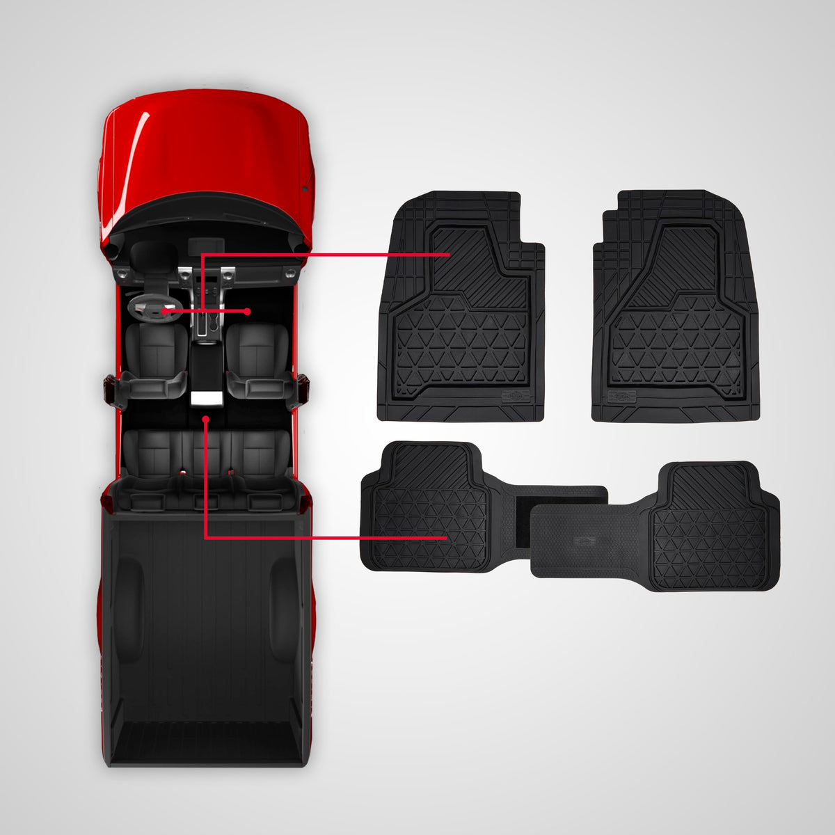 Help Your Interior Handle A Variety Of Harsh Conditions With These Dickies 3-Piece Black Adjustable-Runner Truck Floor Mats. Ideal For Any Season, These Heavy-Duty Mats Are Manufactured To Protect Your Vehicles Floors From The Elements. A Deep-Tray Traps Dirt, Road Salt, Mud, Sand, And More, While Grooved Channels Draw Water And Grime Away From Your Feet. The Design Incorporates A Reinforced Heel Pad That Strengthens Coverage In High-Traffic Areas. Constructed From A Durable Polymer Material, They Not Only Stand Up To Wear And Tear But Will Also Stand The Test Of Time. Our Specially Engineered Anti-Slip Backing Makes Driving Safer By Preventing Sliding Or Shifting When You Take To The Road. Built-In Cut Lines Allow These Quality Mats To Be Trimmed To Fit Almost Any Truck. The Width Of The Rear Runner Can Be Customized With An Adjustable Hook-And-Loop Closure, Allowing It To Span The Entire Floor For Full Coverage. These Quality Mats Can Be Installed In Minutes, And Washing Them Is A Breeze With Soap And Water. You Can Count On Modern Style And Exceptional Performance With These Dickies 3-Piece Black Adjustable-Runner Truck Floor Mats.