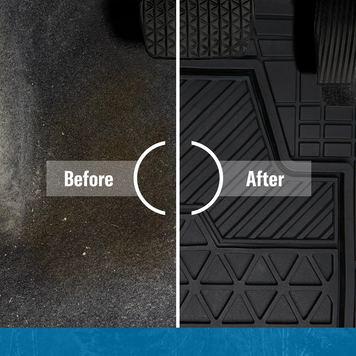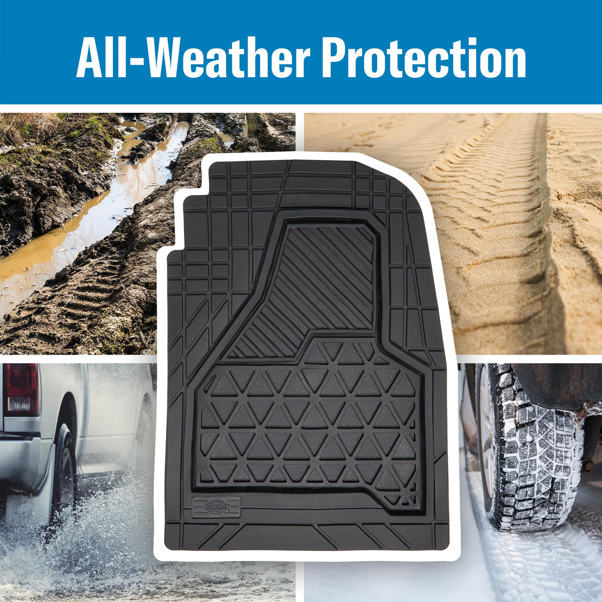 Q: What makes the Dickies 3-Piece Black Adjustable-Runner Truck Floor Mats suitable for all seasons?A: The Dickies truck floor mats are engineered for all-weather performance, designed to handle extreme temperatures, whether hot or cold, as well as wet or dry conditions. This ensures that they protect your vehicle's flooring year-round, making them ideal for any season.