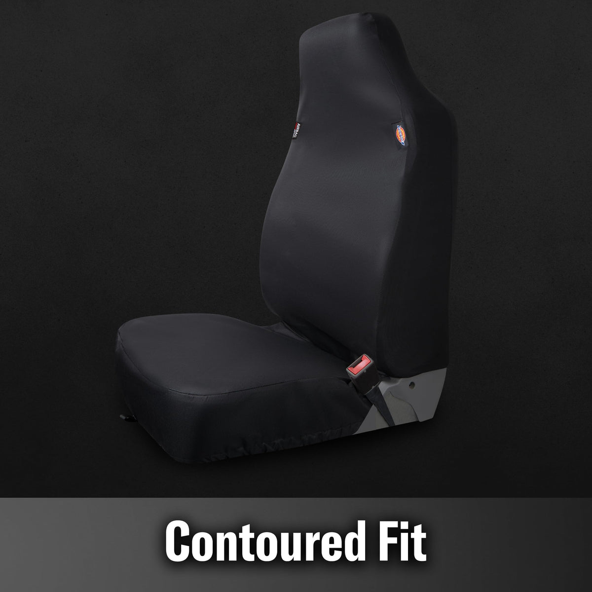 Let your next exciting trip begin with Dickies 3-Piece Trader Black Front and Rear Seat Covers. These heavy-duty seat covers resist wear and tear from work, chores, and recreation. A specially formulated coating also protects the cover and upholstery from getting soaked and damaged by water and other liquids. In addition to a premium modern look that's sure to complement your ride, these rugged covers are suited for vehicles with or without integrated side-impact airbags and utilize no-stitch Laser Deploy technology to ensure the airbags activate safely. They also come equipped with the Express Fit hook- and tie-free installation system, so attaching them comfortably and securely to your seats is quick and easy. Re-engineered straps offer enhanced base stability. The versatile design accommodates front seats with or without adjustable headrests. Rear seats with adjustable headrests will also display a contoured fit and clean, tailored look. The overall fit makes it a smart choice for most cars and SUVs. These covers install in minutes and spot clean effortlessly with a damp cloth. Upgrade your interior with a mix of style and Dickies 3-Piece Trader Black Front and Rear Seat Covers.