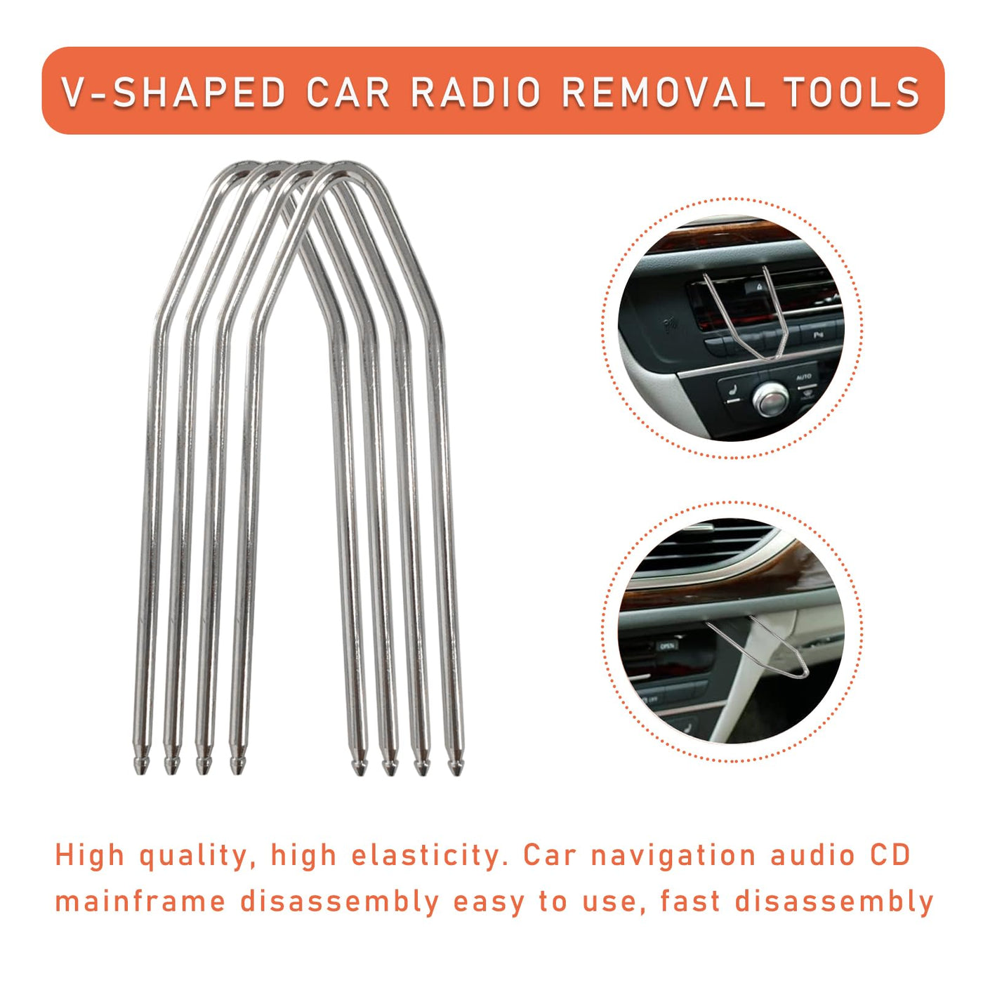 Specification: Material: Stainless Steels Quantity: 2/ 4/ 8PCS Color: Silver Style: U-Shaped/ V-Shaped Size: 4.3 2/ 3.7 1.1 inches Package Includes: 4 U-Shaped Tools, 4 V-Shaped Tools, 2 U-Shaped+2 V-Shaped Tools Weight: 0.12/ 0.09/ 0.21 lb Fit Type: Universal Fit Why should you choose this product? -It prevents scratches and damage to the equipment's surface, preserving its appearance. -Reduces time and effort for disassembly and maintenance tasks. -Great applicability, compatible with most car radios. -A nice gift for family and friends.