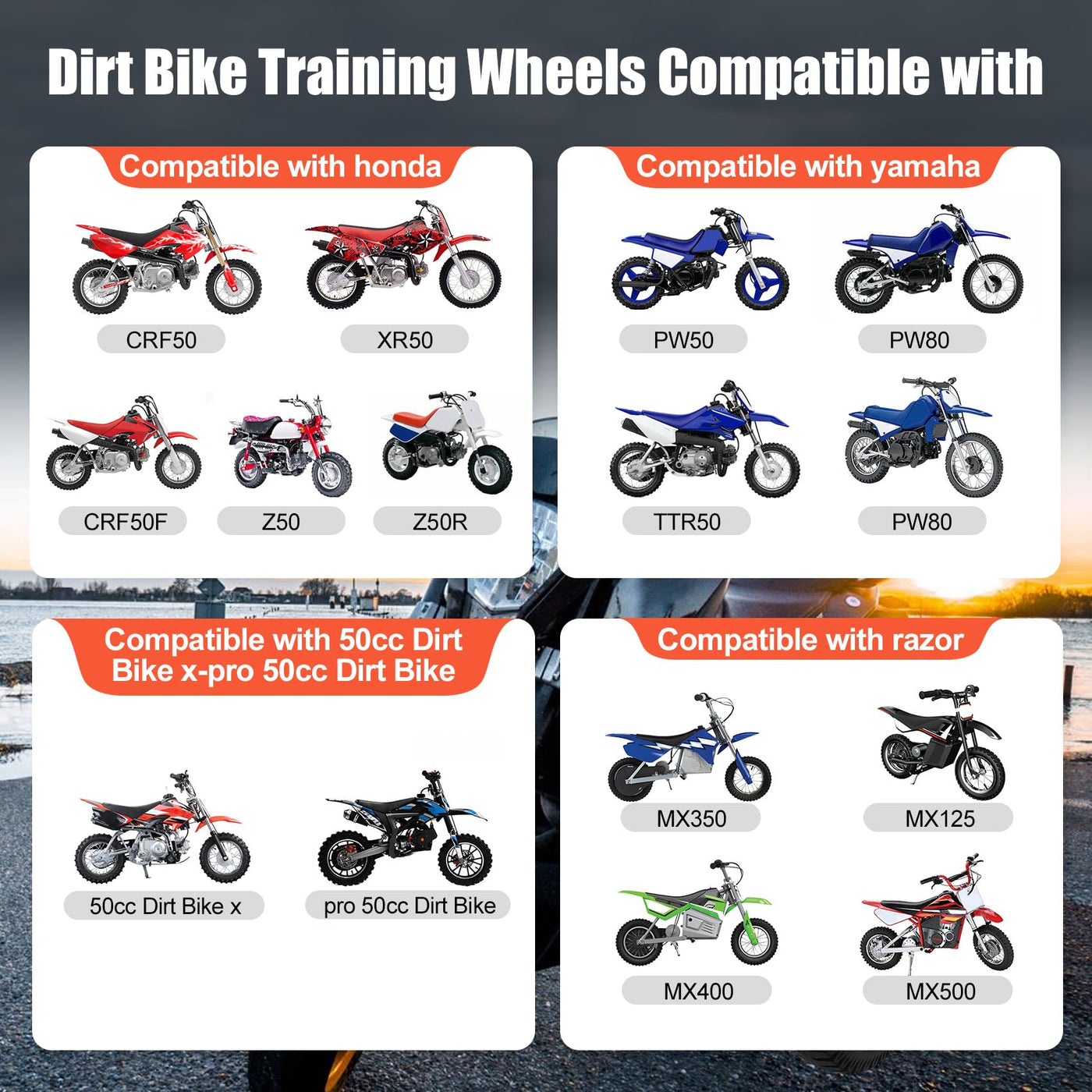 Dirt bike training wheels compatible with razor MX500 MX125 MX400 MX500 honda CRF50 XR50 CRF50F Z50 Z50R yamaha PW50 TTR50 PW80 and other series of 50CC motorcycles, please check before buying Please check the model number before you buy.