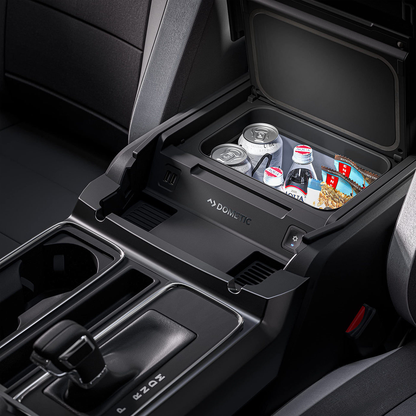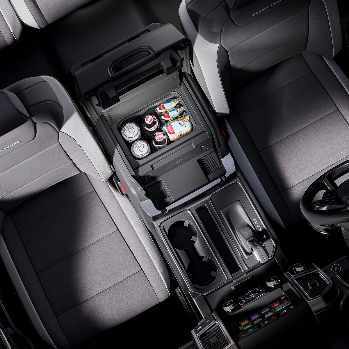 Generous storage capacity of 7.5 liters to fit 12 cans | Powered by 12V | Automotive approved compressor with low noise and energy consumption | Fits Ford F-150 (2015-2020) and Ford Super Duty (2017 & Newer) that have a floor mounted flow-through center console. Also fits Ford Expedition (2018 & Newer) | Soft Touch User Interface