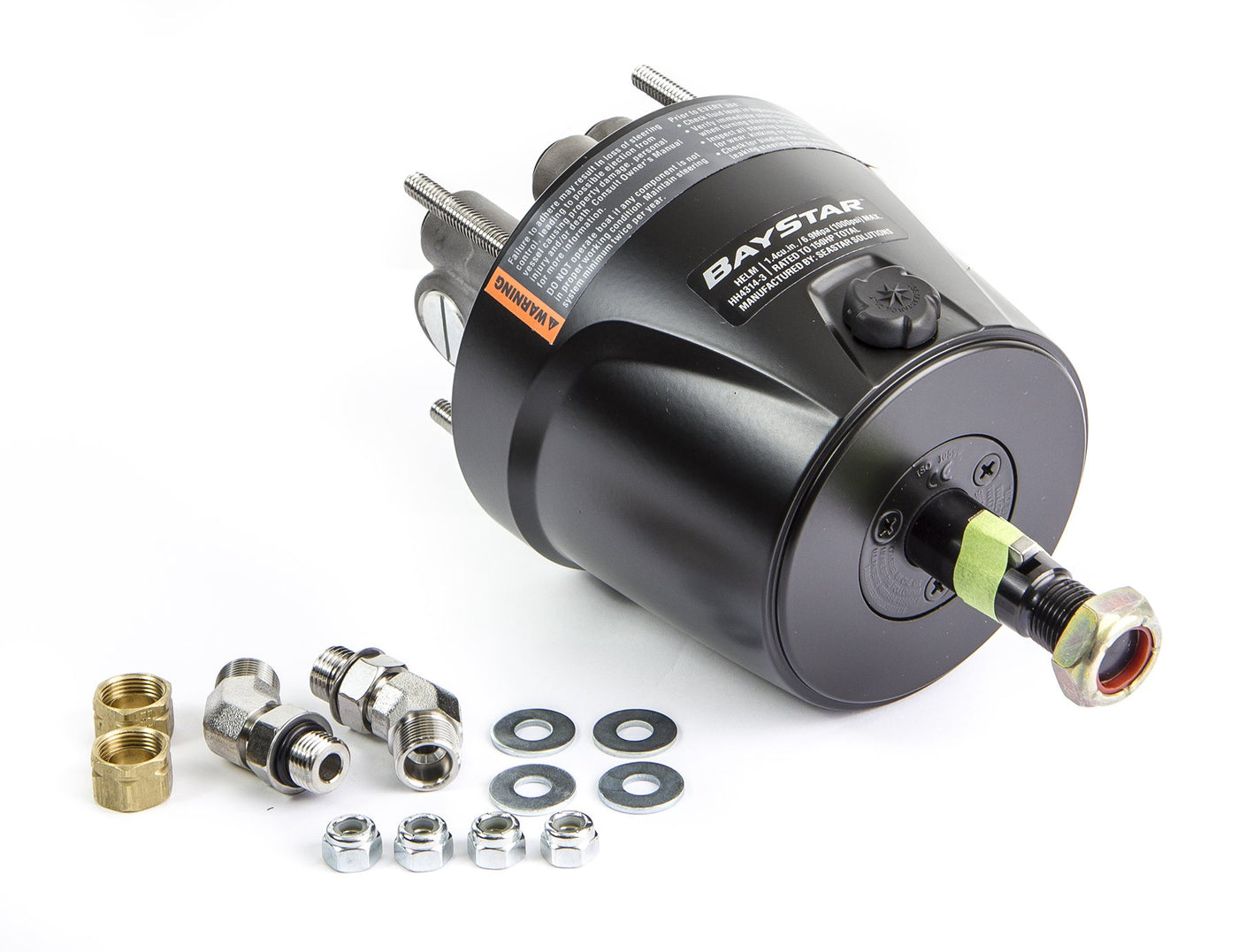 Q: What components are included in the Baystar Steering Kit?A: The Dometic SeaStar Baystar Hydraulic Steering Kit includes a BayStar helm pump (HH4314-3), a BayStar cylinder (HC465H), a BayStar tubing kit (HT4420H with 2 x 20' hoses), two bottles of hydraulic steering fluid (HA5430), and a filler kit (HA5438).