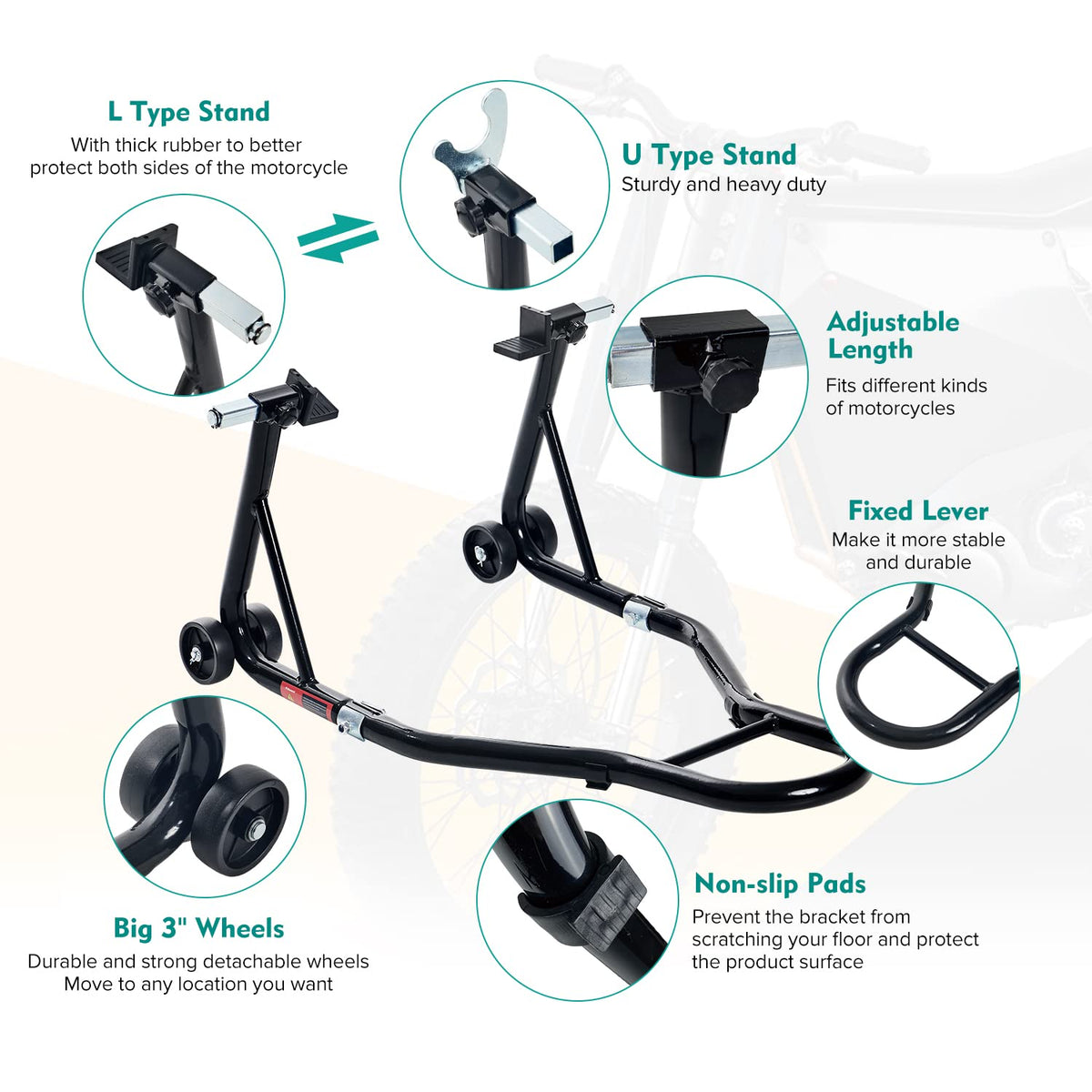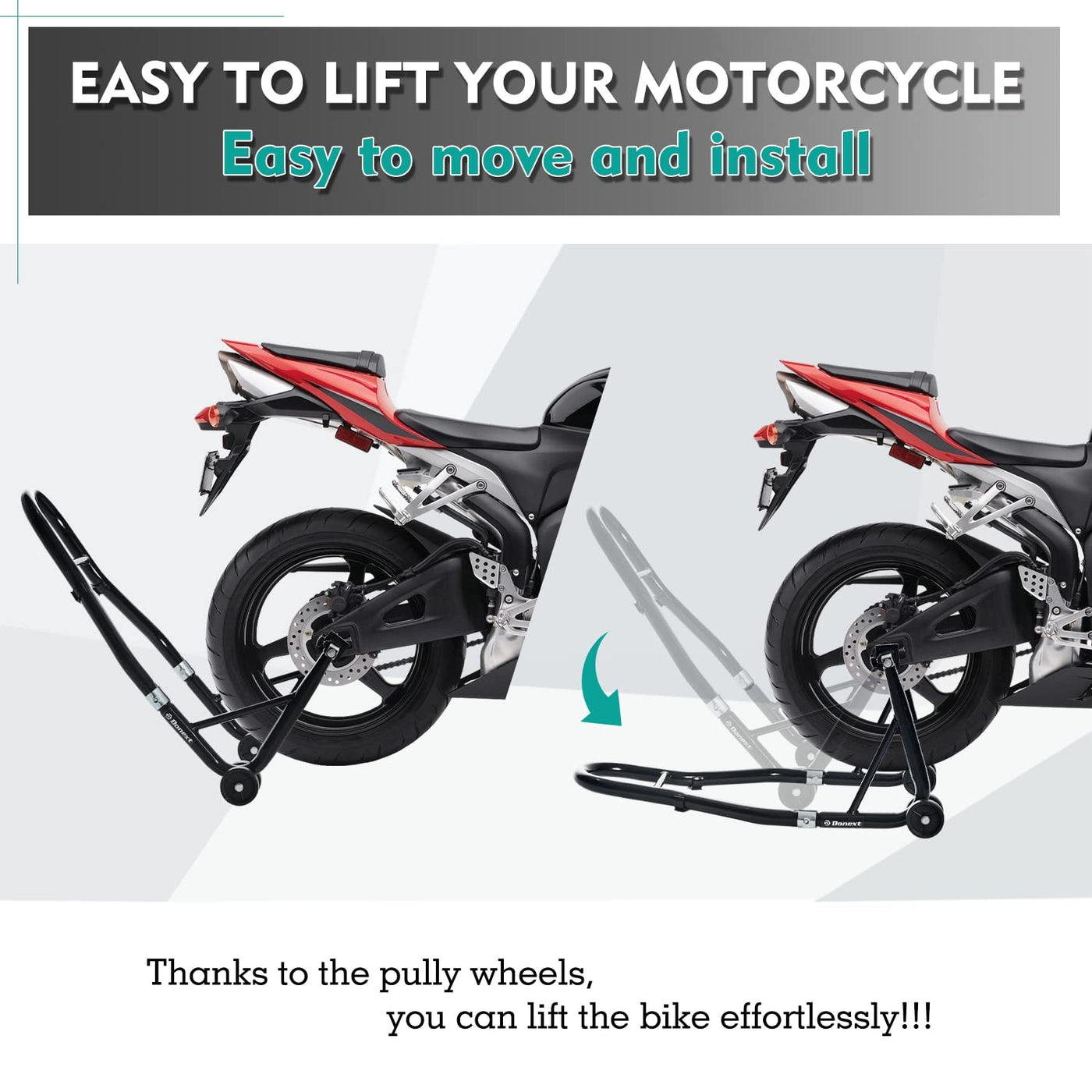*STRONG LOAD CAPACITY: Max capacity - 850 LBS. Strong and stable, holds your bike firmly | *HIGH-QUALITY MATERIAL: Made of industrial-grade steel with a smooth and high gloss finish for good oil, dirt and corrosion resistance. Can be used for a long time without deformation | *GOOD STABILITY: Durable protection pads can reduce vibration and increase friction. Our stand can make your maintenance safer and easier | *ADJUSTABLE DESIGN: Suitable for most motorcycles, such as Yamaha, Honda, BMW, Kawasaki, Suzuki, etc. | *EASY TO USE: Easy to assemble according to the page picture introductions. Easy to move because of 4 high quality PP wheels. It is designed to make your motorcycle maintenance more convenient