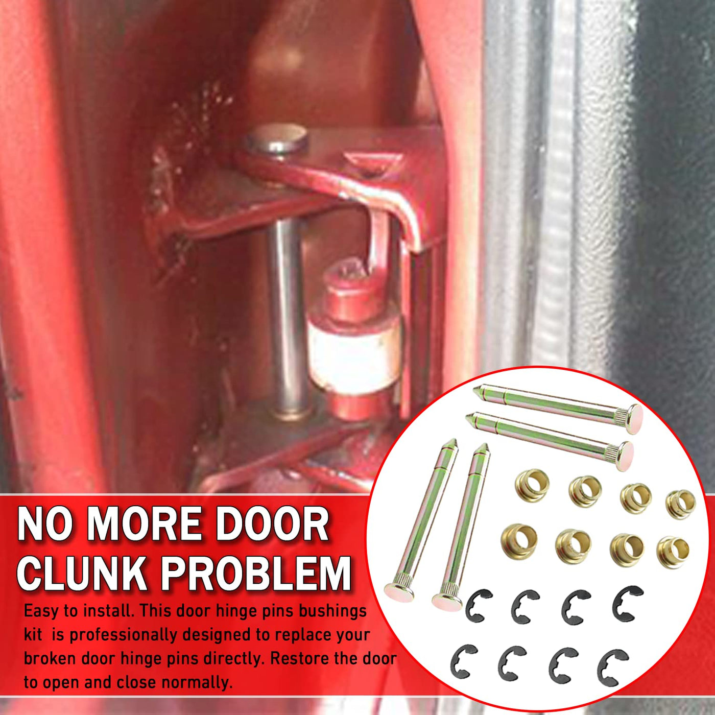 Q: What is included in the Door Hinge Pins Bushings Kit package?A: The package includes 4 door hinge pins, 8 door bushings, and 8 E-ring clips, allowing you to complete the hinge repair effectively.