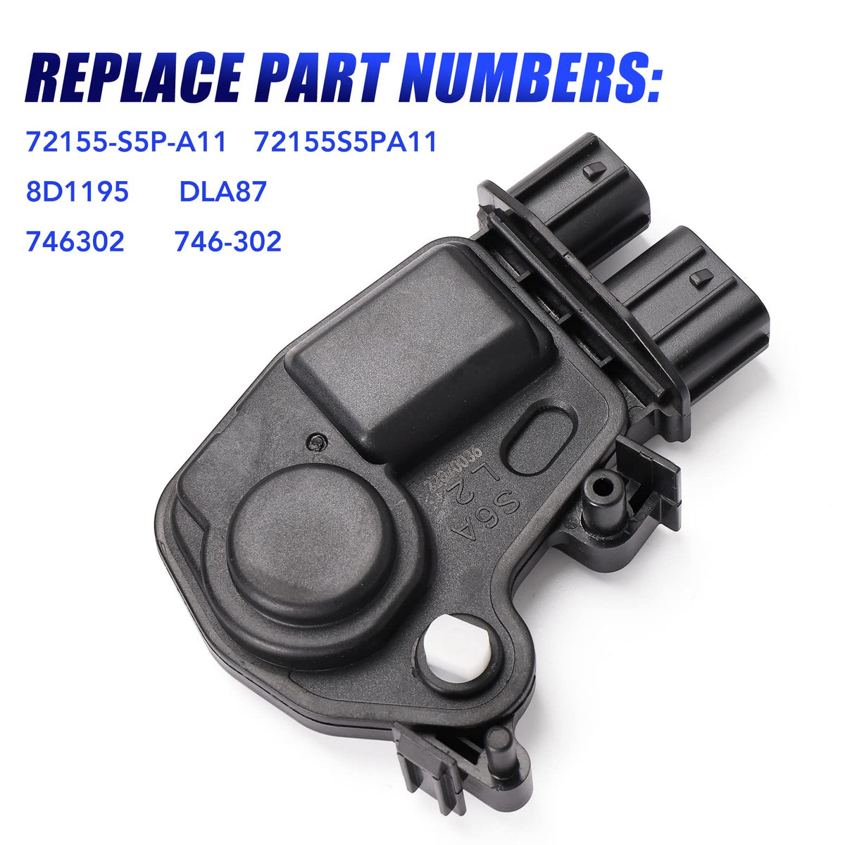 Q: What part numbers does this Door Lock Actuator replace?A: This Door Lock Actuator replaces several part numbers, including 72155-S5P-A11, 72155S5PA11, 8D1195, DLA87, and 746302. Always verify compatibility with your vehicle's specifications before purchasing.