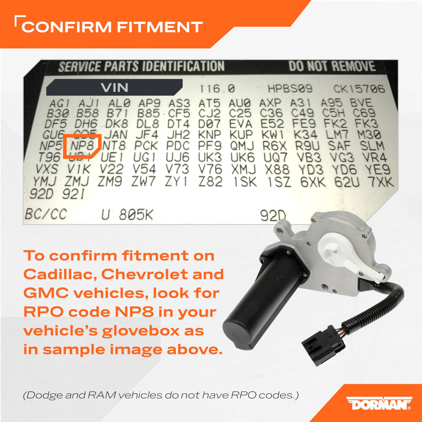 Q: How do I confirm if this transfer case motor will fit my vehicle?A: To confirm fitment, you can use the garage tool available on the product page. Simply input your vehicle's make, model, and trim level to ensure that the Dorman 600-910 Transfer Case Motor is the right fit for your specific vehicle.