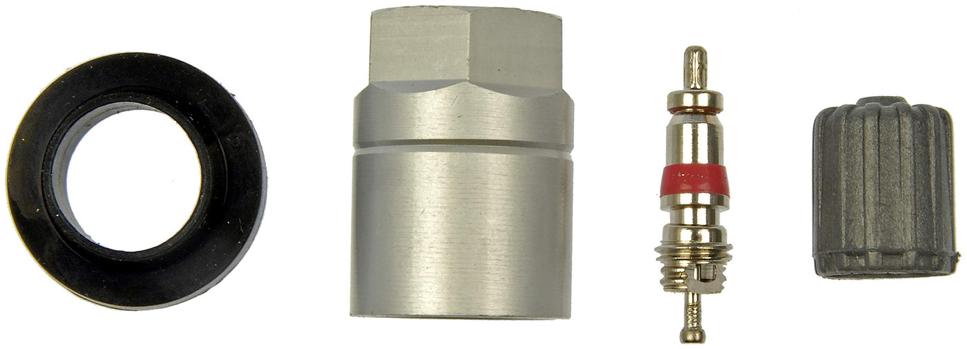 Q: What components are included in the TPMS Sensor Service Kit?A: This tire pressure monitoring system (TPMS) sensor hardware kit includes all necessary replacement components: a valve stem core, a new rubber seal, and a valve stem threaded neck and cap for complete installation.