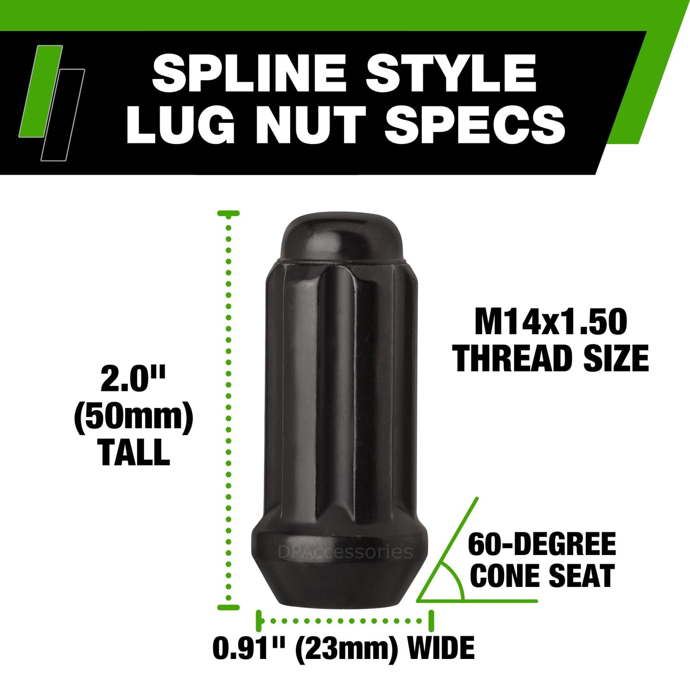 Q: What are the specifications of these lug nuts?A: The DPAccessories lug nuts have an M14x1.50 thread size, a closed end duplex XL spline tuner style, a conical 60-degree seat, and dimensions of 51.31mm long and 23.11mm wide.